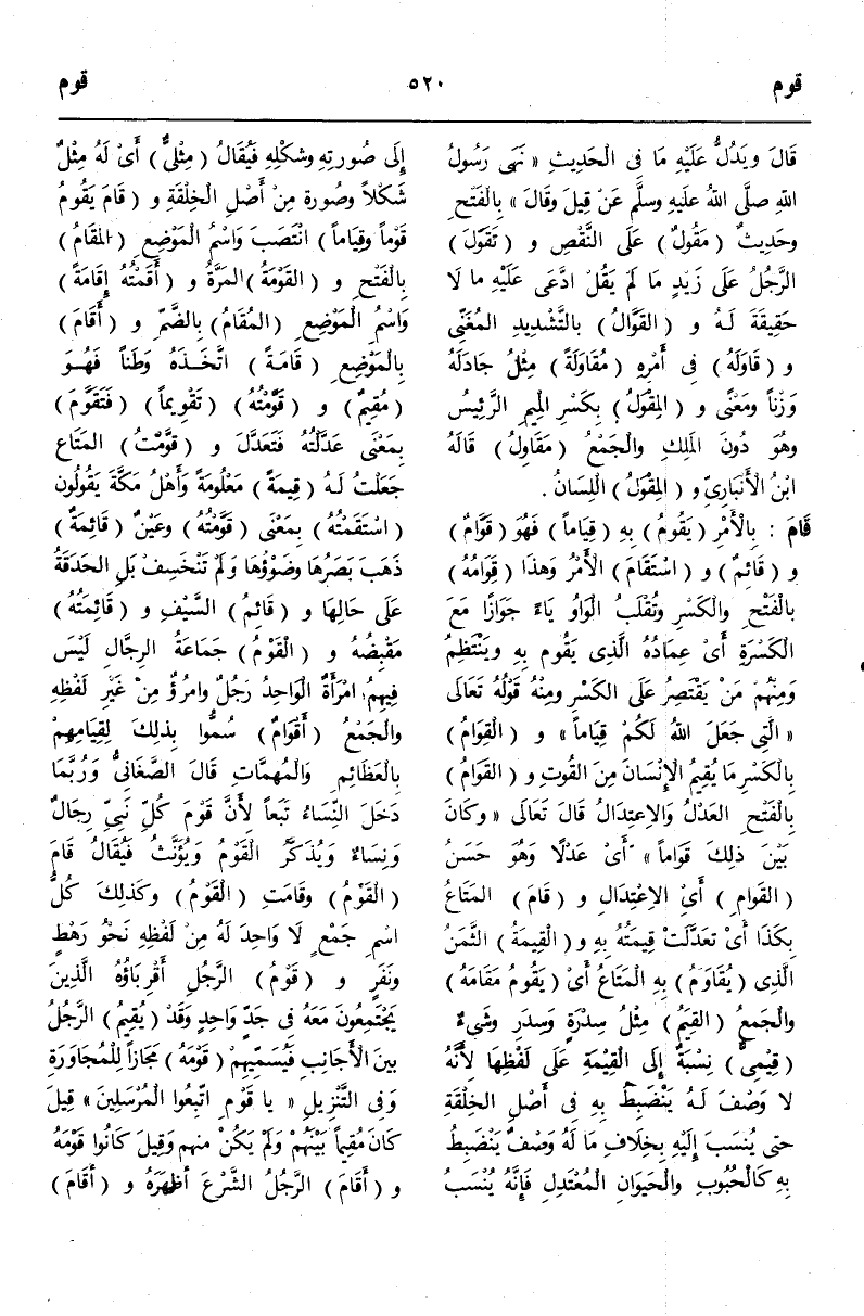 (ق وم) : قَامَ بِالْأَمْرِ يَقُومُ بِهِ قِيَامًا فَهُوَ قَوَّامٌ وَقَائِمٌ وَاسْتَقَامَ الْأَمْرُ وَهَذَا قِوَامُهُ بِالْفَتْحِ وَالْكَسْرِ وَتُقْلَبُ الْوَاوُ يَاءً جَوَازًا مَعَ الْكَسْرَةِ أَيْ عِمَادُهُ الَّذِي يَقُومُ بِهِ وَيَنْتَظِمُ وَمِنْهُمْ مَنْ يَقْتَصِرُ عَلَى الْكَسْرِ وَمِنْهُ قَوْله تَعَالَى {الَّتِي جَعَلَ اللَّهُ لَكُمْ قِيَامًا} [النساء: 5] وَالْقِوَامُ بِالْكَسْرِ مَا يُقِيمُ الْإِنْسَانَ مِنْ الْقُوتِ وَالْقَوَامُ بِالْفَتْحِ الْعَدْلُ وَالِاعْتِدَالُ قَالَ تَعَالَى {وَكَانَ بَيْنَ ذَلِكَ قَوَامًا} [الفرقان: 67] أَيْ عَدْلًا وَهُوَ حَسَنُ الْقَوَامِ أَيْ الِاعْتِدَالِ وَقَامَ الْمَتَاعُ بِكَذَا أَيْ تَعَدَّلَتْ قِيمَتُهُ بِهِ وَالْقِيمَةُ الثَّمَنُ الَّذِي يُقَاوَمُ بِهِ الْمَتَاعُ أَيْ يَقُومُ مَقَامَهُ وَالْجَمْعُ الْقِيَمُ مِثْلُ سِدْرَةٍ وَسِدَرٍ وَشَيْءٌ قِيَمِيٌّ نِسْبَةٌ إلَى الْقِيمَةِ عَلَى لَفْظِهَا لِأَنَّهُ لَا وَصْفَ لَهُ يَنْضَبِطُ بِهِ فِي أَصْلِ الْخِلْقَةِ حَتَّى يُنْسَبَ إلَيْهِ بِخِلَافِ مَا لَهُ وَصْفٌ يَنْضَبِطُ بِهِ كَالْحُبُوبِ وَالْحَيَوَانِ الْمُعْتَدِلِ فَإِنَّهُ يُنْسَبُ إلَى صُورَتِهِ وَشَكْلِهِ فَيُقَالُ مِثْلِيٌّ أَيْ لَهُ مِثْلٌ شَكْلًا وَصُورَةً مِنْ أَصْلِ الْخِلْقَةِ وَقَامَ يَقُومُ قَوْمًا وَقِيَامًا انْتَصَبَ وَاسْمُ الْمَوْضِعِ الْمَقَامُ بِالْفَتْحِ وَالْقَوْمَةُ الْمَرَّةُ وَأَقَمْتُهُ إقَامَةً وَاسْمُ الْمَوْضِعِ الْمُقَامُ بِالضَّمِّ وَأَقَامَ بِالْمَوْضِعِ إقَامَةً اتَّخَذَهُ وَطَنًا فَهُوَ مُقِيمٌ وَقَوَّمْتُهُ تَقْوِيمًا فَتَقَوَّمَ بِمَعْنَى عَدَّلْتُهُ فَتَعَدَّلَ وَقَوَّمْتُ الْمَتَاعَ جَعَلْتُ لَهُ قِيمَةً مَعْلُومَةً وَأَهْلُ مَكَّةَ يَقُولُونَ اسْتَقَمْتُهُ بِمَعْنَى قَوَّمْتُهُ وَعَيْنٌ قَائِمَةٌ ذَهَبَ بَصَرُهَا وَضَوْءُهَا وَلَمْ تَنْخَسِفْ بَلْ الْحَدَقَةُ عَلَى حَالِهَا وَقَائِمُ السَّيْفِ وَقَائِمَتُهُ مَقْبِضُهُ وَالْقَوْمُ جَمَاعَةُ الرِّجَالِ لَيْسَ فِيهِمْ امْرَأَةٌ الْوَاحِدُ رَجُلٌ وَامْرُؤٌ مِنْ غَيْرِ لَفْظِهِ وَالْجَمْعُ أَقْوَامٌ سُمُّوا بِذَلِكَ لِقِيَامِهِمْ بِالْعَظَائِمِ وَالْمُهِمَّاتِ قَالَ الصَّغَانِيّ وَرُبَّمَا دَخَلَ النِّسَاءُ تَبَعًا لِأَنَّ قَوْمَ كُلِّ نَبِيٍّ رِجَالٌ وَنِسَاءٌ وَيُذَكَّرُ الْقَوْمُ وَيُؤَنَّثُ فَيُقَالُ قَامَ الْقَوْمُ وَقَامَتْ الْقَوْمُ وَكَذَلِكَ كُلُّ اسْمِ جَمْعٍ لَا وَاحِدَ لَهُ مِنْ لَفْظِهِ نَحْوُ رَهْطٍ وَنَفَرٍ وَقَوْمُ الرَّجُلِ أَقْرِبَاؤُهُ الَّذِينَ يَجْتَمِعُونَ مَعَهُ فِي جَدٍّ وَاحِدٍ وَقَدْ يُقِيمُ الرَّجُلُ بَيْنَ الْأَجَانِبِ فَيُسَمِّيهِمْ قَوْمَهُ مَجَازًا لِلْمُجَاوَرَةِ.