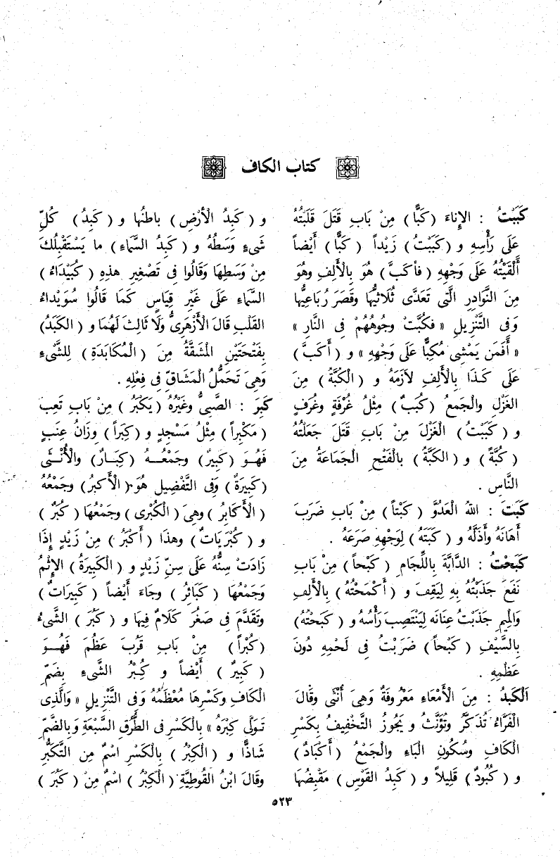 -[524]- الْأَمْرُ وَالذَّنْبُ كُبْرًا إذَا عَظُمَ وَالْكِبْرُ الْعَظَمَةُ وَالْكِبْرِيَاءُ مِثْلُهُ وَكَابَرْتُهُ مُكَابَرَةً غَالَبْتُهُ مُغَالَبَةً وَعَانَدْتُهُ وَأَكْبَرْتُهُ إكْبَارًا اسْتَعْظَمْتُهُ وَوَرِثُوا الْمَجْدَ كَابِرًا عَنْ كَابِرٍ أَيْ كَبِيرًا شَرِيفًا عَنْ كَبِيرٍ شَرِيفٍ وَيَكُونُ أَكْبَرُ بِمَعْنَى كَبِيرٍ تَقُولُ الْأَكْبَرُ وَالْأَصْغَرُ أَيْ الْكَبِيرُ وَالصَّغِيرُ وَمِنْهُ عِنْدَ بَعْضِهِمْ اللَّهُ أَكَبَرُ أَيْ الْكَبِيرُ وَعِنْدَ بَعْضِهِمْ اللَّهُ أَكْبَرُ مِنْ كُلِّ كَبِيرٍ وَعَلَتْهُ كَبْرَةٌ مِثْلُ تَمْرَةٍ إذَا كَبِرَ وَأَسَنَّ وَالْوَلَاءُ لِلْكُبْرِ بِالضَّمِّ أَيْ لِمَنْ هُوَ أَقْعَدُ بِالنَّسَبِ وَأَقْرَبُ وَالْكَبَرُ بِفَتْحَتَيْنِ الطَّبْلُ لَهُ وَجْهٌ وَاحِدٌ وَجَمْعُهُ كِبَارٌ مِثْلُ جَبَلٍ وَجِبَالٍ وَهُوَ فَارِسِيٌّ مُعَرَّبٌ وَهُوَ بِالْعَرَبِيَّةِ أَصَفٌ بِصَادٍ مُهْمَلَةٍ وِزَانُ سَبَبٍ وَقَدْ يُجْمَعُ عَلَى أَكْبَارٍ مِثْلُ سَبَبٍ وَأَسْبَابٍ وَلِهَذَا قَالَ الْفُقَهَاءُ لَا يَجُوزُ أَنْ يُمَدَّ التَّكْبِيرُ فِي التَّحَرُّمِ عَلَى الْبَاءِ لِئَلَّا يَخْرُجَ عَنْ مَوْضُوعِ التَّكْبِيرِ إلَى لَفْظِ الْأَكْبَارِ الَّتِي هِيَ جَمْعُ الطَّبْلِ وَالْكِبْرِيتُ فِعْلِيتٌ مَعْرُوفٌ.