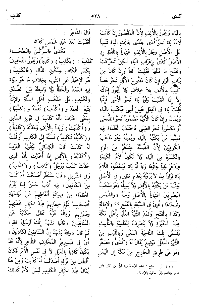 (ك ذ ب) : كَذَبَ يَكْذِبُ كَذِبًا وَيَجُوزُ التَّخْفِيفُ بِكَسْرِ الْكَافِ وَسُكُونِ الذَّالِ فَالْكَذِبُ هُوَ الْإِخْبَارُ عَنْ الشَّيْءِ بِخِلَافِ مَا هُوَ سَوَاءٌ فِيهِ الْعَمْدُ وَالْخَطَأُ وَلَا وَاسِطَةَ بَيْنَ الصِّدْقِ وَالْكَذِبِ عَلَى مَذْهَبِ أَهْلِ السُّنَّةِ وَالْإِثْمُ يَتْبَعُ الْعَمْدَ وَأَكْذَبَ نَفْسَهُ وَكَذَّبَهَا بِمَعْنَى اعْتَرَفَ بِأَنَّهُ كَذَبَ فِي قَوْلِهِ السَّابِقِ وَأَكْذَبْتُ زَيْدًا بِالْأَلِفِ وَجَدْتُهُ كَاذِبًا وَكَذَّبْتُهُ تَكْذِيبًا نَسَبْتُهُ إلَى الْكَذِبِ أَوْ قُلْت لَهُ كَذَبْت قَالَ الْكِسَائِيُّ وَتَقُولُ الْعَرَبُ أَكْذَبْتُهُ بِالْأَلِفِ إذَا أَخْبَرْتُ بِأَنَّ الَّذِي حَدَّثَ كَذِبٌ وَرَجُلٌ كَاذِبٌ وَكَذَّابٌ.