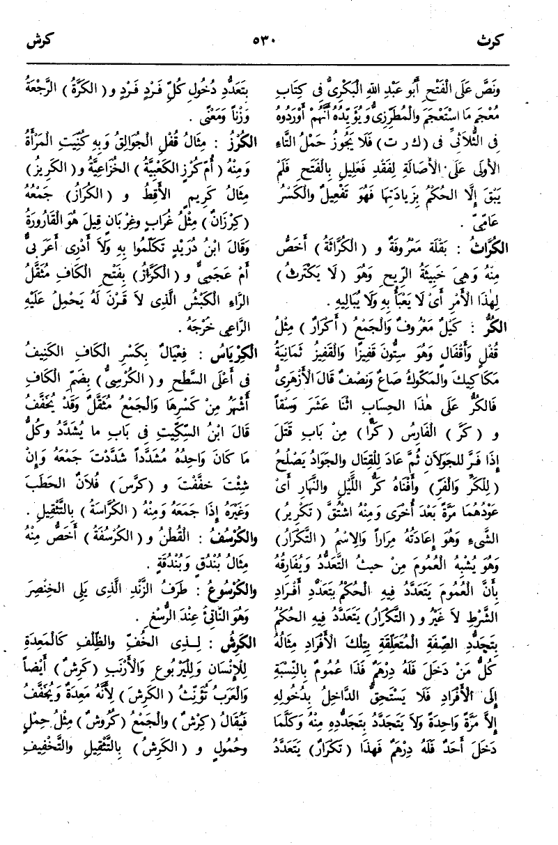 (ك ر ر) : الْكُرُّ كَيْلٌ مَعْرُوفٌ وَالْجَمْعُ أَكْرَارٌ مِثْلُ قُفْلٍ وَأَقْفَالٍ وَهُوَ سِتُّونَ قَفِيزًا وَالْقَفِيزُ ثَمَانِيَةُ مَكَاكِيكَ وَالْمَكُّوكُ صَاعٌ وَنِصْفٌ قَالَ الْأَزْهَرِيُّ فَالْكُرُّ عَلَى هَذَا الْحِسَابِ اثْنَا عَشَرَ وَسْقًا.