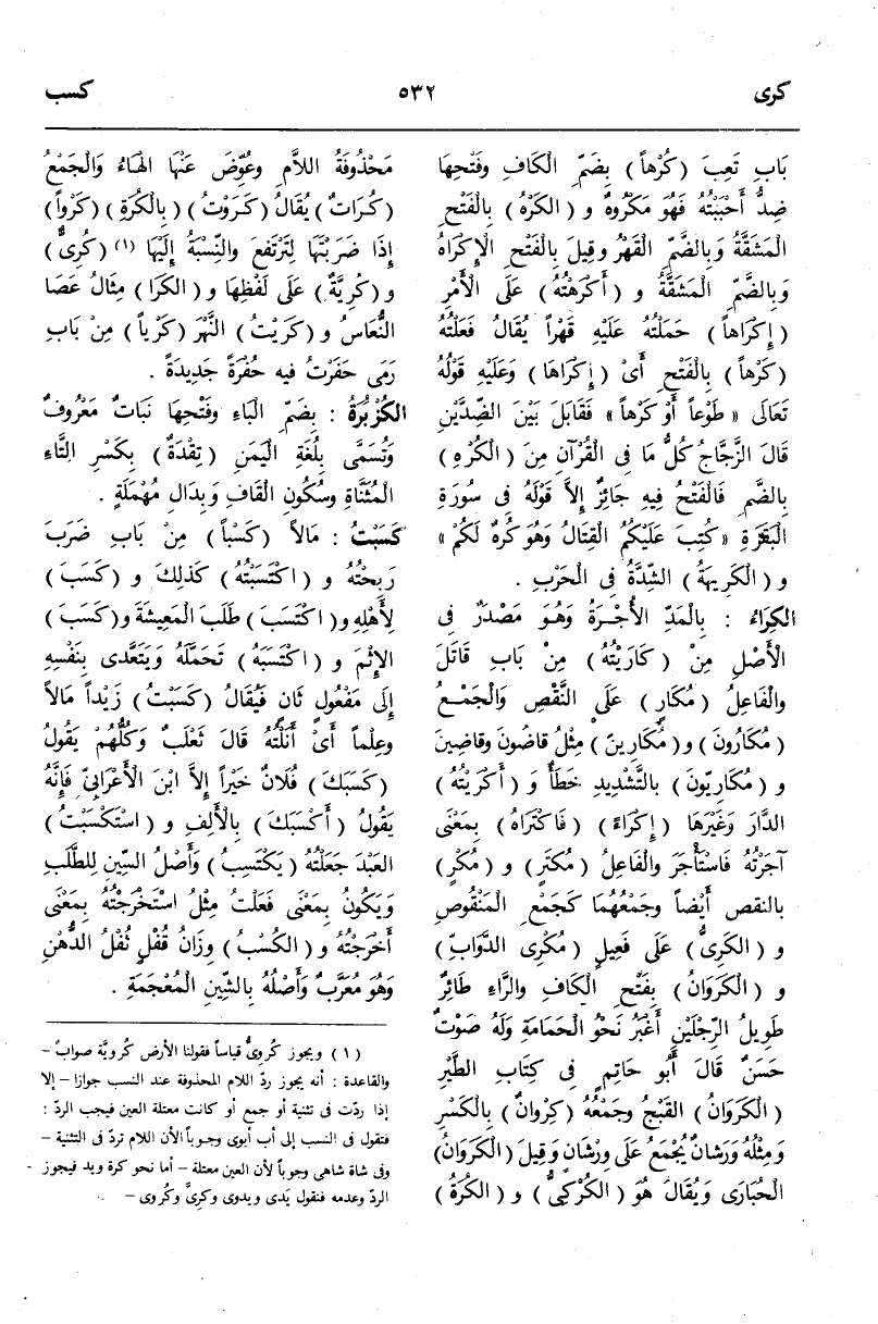 وَالْكَرَوَانُ بِفَتْحِ الْكَافِ وَالرَّاءِ طَائِرٌ طَوِيلٌ الرِّجْلَيْنِ أَغْبَرُ نَحْوُ الْحَمَامَةِ وَلَهُ صَوْتٌ حَسَنٌ قَالَ أَبُو حَاتِمٍ فِي كِتَابِ الطَّيْرِ الْكَرَوَانُ الْقَبَجُ وَجَمْعُهُ كِرْوَانٌ بِالْكَسْرِ وَمِثْلُهُ وَرَشَانٌ يُجْمَعُ عَلَى وِرْشَانٍ وَقِيلَ الْكَرَوَانُ الْحُبَارَى وَيُقَالَ هُوَ الْكُرْكِيُّ وَالْكُرَةُ مَحْذُوفَةُ اللَّامِ وَعُوِّضَ عَنْهَا الْهَاءُ وَالْجَمْعُ كُرَاتٌ يُقَالُ كَرَوْتُ بِالْكُرَةِ كَرْوًا إذَا ضَرَبْتُهَا لِتَرْتَفِعَ وَالنِّسْبَةُ إلَيْهَا (¬1) كُرَيٌّ وَكُرَيَّةٌ عَلَى لَفْظِهَا.