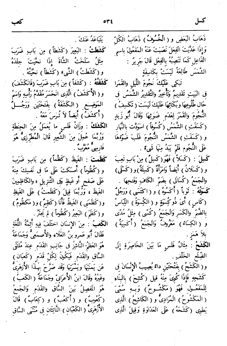 (ك ع ب) : الْكَعْبُ مِنْ الْإِنْسَانِ اخْتَلَفَ فِيهِ أَئِمَّةُ اللُّغَةِ فَقَالَ أَبُو عَمْرِو بْنُ الْعَلَاءِ وَالْأَصْمَعِيُّ وَجَمَاعَةٌ هُوَ الْعَظْمُ النَّاشِزُ فِي جَانِبِ الْقَدَمِ عِنْدَ مُلْتَقَى السَّاقِ وَالْقَدَمِ فَيَكُونُ لِكُلِّ قَدَمٍ كَعْبَانِ عَنْ يَمْنَتِهَا وَيَسْرَتِهَا وَقَدْ صَرَّحَ بِهَذَا الْأَزْهَرِيُّ وَغَيْرُهُ.