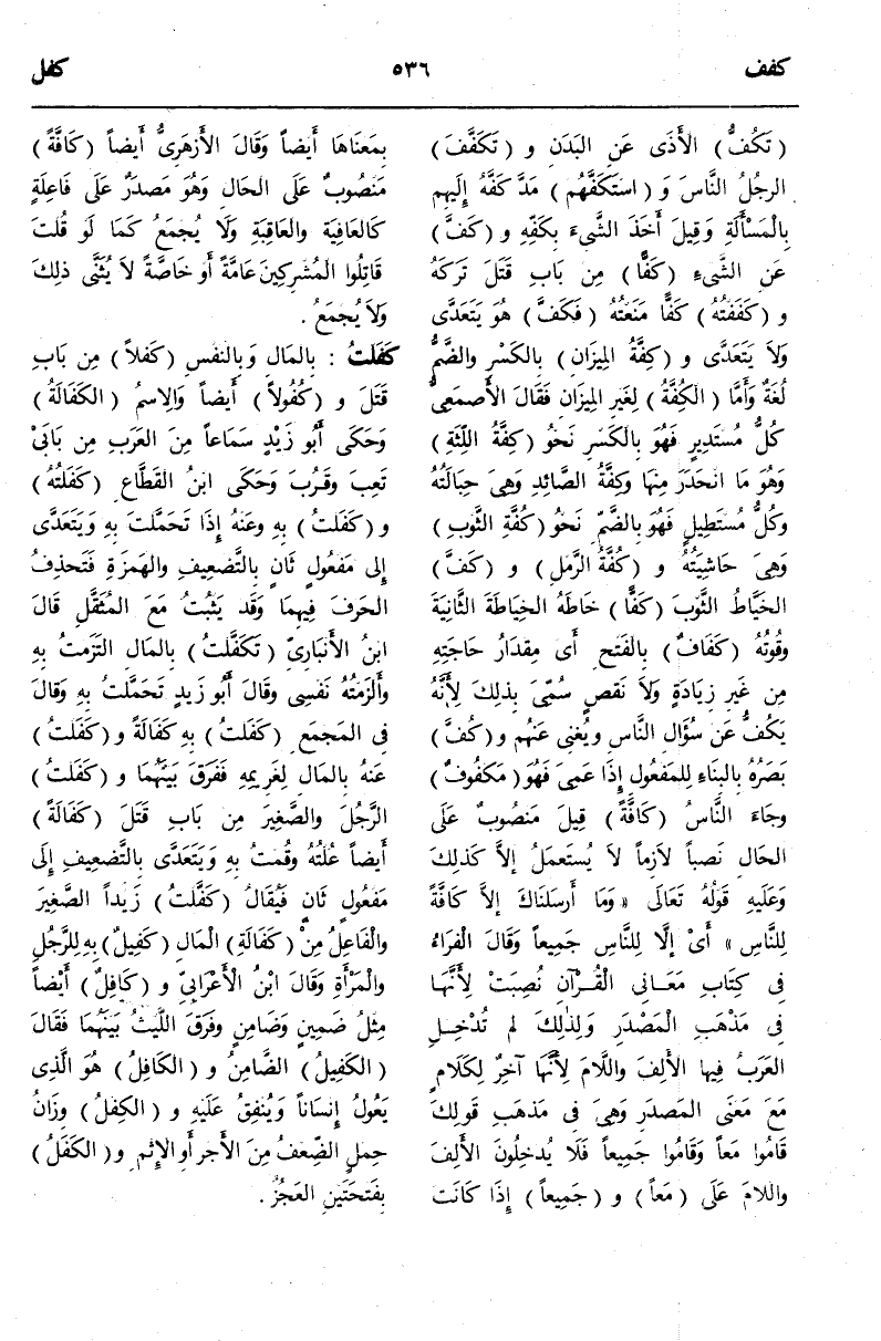 وَقَالَ ابْنُ الْأَعْرَابِيِّ: وَكَافِلٌ أَيْضًا مِثْلُ ضَمِينٍ وَضَامِنٍ وَفَرَّقَ اللَّيْثُ بَيْنَهُمَا فَقَالَ الْكَفِيلُ الضَّامِنُ وَالْكَافِلُ هُوَ الَّذِي يَعُولُ إنْسَانًا وَيُنْفِقُ عَلَيْهِ وَالْكِفْلُ وِزَانُ حِمْلٍ الضِّعْفُ مِنْ الْأَجْرِ أَوْ الْإِثْمِ وَالْكَفَلُ بِفَتْحَتَيْنِ الْعَجُزُ.