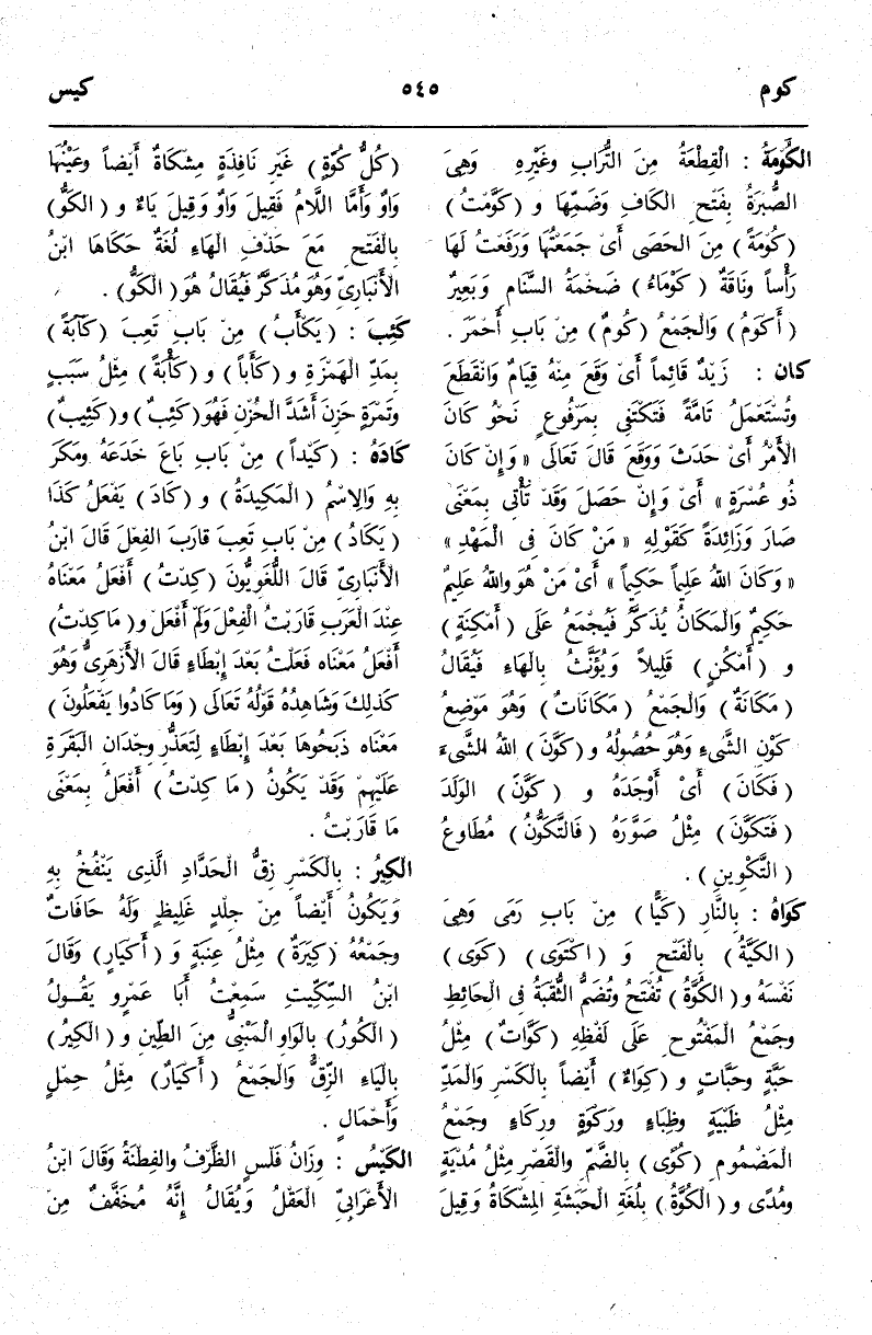 (ك ون) : كَانَ زَيْدٌ قَائِمًا أَيْ وَقَعَ مِنْهُ قِيَامٌ وَانْقَطَعَ وَتُسْتَعْمَلُ تَامَّةً فَتَكْتَفِي بِمَرْفُوعٍ نَحْوَ كَانَ الْأَمْرُ أَيْ حَدَثَ وَوَقَعَ قَالَ تَعَالَى {وَإِنْ كَانَ ذُو عُسْرَةٍ} [البقرة: 280] أَيْ وَإِنْ حَصَلَ وَقَدْ تَأْتِي بِمَعْنَى صَارَ وَزَائِدَةً كَقَوْلِهِ {مَنْ كَانَ فِي الْمَهْدِ} [مريم: 29] {وَكَانَ اللَّهُ عَلِيمًا حَكِيمًا} [النساء: 17] أَيْ مَنْ هُوَ وَاَللَّهُ عَلِيمٌ حَكِيمٌ وَالْمَكَانُ يُذَكَّرُ فَيُجْمَعُ عَلَى أَمْكِنَةٍ وَأَمْكُنٍ قَلِيلًا وَيُؤَنَّثُ بِالْهَاءِ فَيُقَالُ مَكَانَةٌ وَالْجَمْعُ مَكَانَاتٌ وَهُوَ مَوْضِعُ كَوْنِ الشَّيْءِ وَهُوَ حُصُولُهُ.
