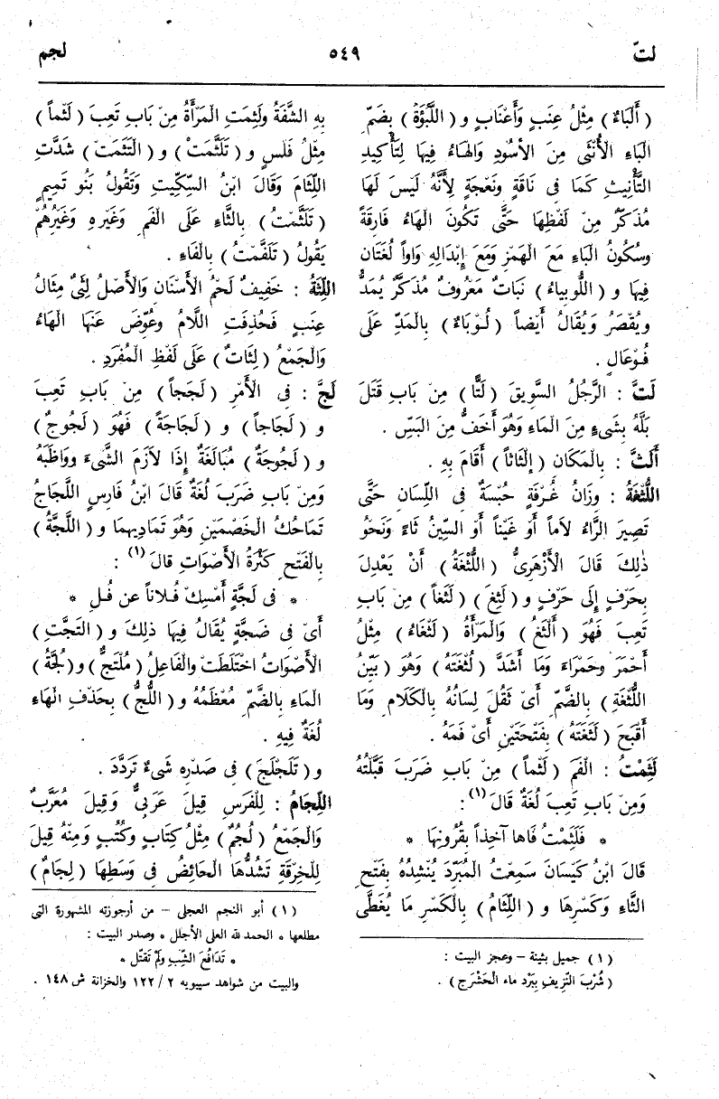 -[550]- وَتَلَجَّمَتْ الْمَرْأَةُ شَدَّتْ اللِّجَامَ فِي وَسَطِهَا وَأَلْجَمْتُ الْفَرَسَ إلْجَامًا جَعَلْتُ اللِّجَامَ فِي فِيهِ وَبِاسْمِ الْمَفْعُولِ سُمِّيَ الرَّجُلُ.
