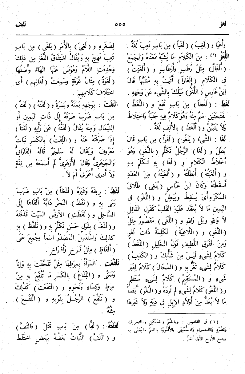 (ل غ و) : لَغَا الشَّيْءُ يَلْغُو لَغْوًا مِنْ بَابِ قَالَ بَطَلَ وَلَغَا الرَّجُلُ تَكَلَّمَ بِاللَّغْوِ وَهُوَ أَخْلَاطُ الْكَلَامِ وَلَغَا بِهِ تَكَلَّمَ بِهِ وَأَلْغَيْتُهُ أَبْطَلْتُهُ وَأَلْغَيْتُهُ مِنْ الْعَدَدِ أَسْقَطْتُهُ وَكَانَ ابْنُ عَبَّاسٍ يُلْغِي طَلَاقَ الْمُكْرَهِ أَيْ يُسْقِطُ وَيُبْطِلُ وَاللَّغْوُ فِي الْيَمِينِ مَا لَا يُعْقَدُ عَلَيْهِ الْقَلْبُ كَقَوْلِ الْقَائِلِ لَا وَاَللَّهِ وَبَلَى وَاَللَّهِ وَاللَّغَى مَقْصُورٌ مِثْلُ اللَّغْوِ وَاللَّاغِيَةُ الْكَلِمَةُ ذَاتُ لَغْوٍ وَمِنْ الْفَرْقِ اللَّطِيفِ قَوْلُ الْخَلِيلِ اللَّغَطُ كَلَامٌ لِشَيْءٍ لَيْسَ مِنْ شَأْنِكَ وَالْكَذِبُ كَلَامٌ لِشَيْءٍ تَغُرُّ بِهِ وَالْمُحَالُ كَلَامٌ لِغَيْرِ شَيْءٍ وَالْمُسْتَقِيمُ كَلَامٌ لِشَيْءٍ مُنْتَظِمٍ وَاللَّغْوُ كَلَامٌ لِشَيْءٍ لَمْ تُرِدْهُ