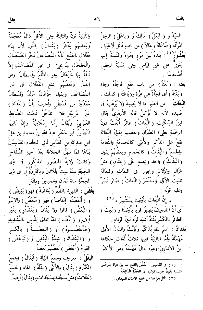 (ب غ د) : بَغْدَادُ اسْمُ بَلَدٍ يُذَكَّرُ وَيُؤَنَّثُ وَالدَّالُ الْأُولَى مُهْمَلَةٌ وَأَمَّا الثَّانِيَةُ فَفِيهَا ثَلَاثُ لُغَاتٍ حَكَاهَا ابْنُ الْأَنْبَارِيِّ وَغَيْرُهُ دَالٌ مُهْمَلَةٌ وَهُوَ الْأَكْثَرُ وَالثَّانِيَةُ نُونٌ وَالثَّالِثَةُ وَهِيَ الْأَقَلُّ ذَالٌ مُعْجَمَةٌ وَبَعْضُهُمْ يَخْتَارُ بَغْدَانَ بِالنُّونِ لِأَنَّ بِنَاءَ فَعْلَالٍ بِالْفَتْحِ بَابُهُ الْمُضَاعَفُ نَحْوَ الصَّلْصَالِ وَالْخَلْخَالِ وَلَمْ يَجِئْ فِي غَيْرِ الْمُضَاعَفِ إلَّا نَاقَةٌ بِهَا خَزْعَالٌ وَهُوَ الظَّلْعُ وَقَسْطَالٌ وَهُوَ الْغُبَارُ وَبَعْضُهُمْ يَمْنَعُ الْفَعْلَالَ فِي غَيْرِ الْمُضَاعَفِ وَيَقُولُ: خَزْعَالٌ مُوَلَّدٌ وَقَسْطَالٌ مَمْدُودٌ مِنْ قَسْطَلٍ وَأُجِيبَ بِأَنَّ بَغْدَادَ غَيْرُ عَرَبِيَّةٍ فَلَا تَدْخُلُ تَحْتَ الضَّابِطِ الْعَرَبِيِّ وَيُقَالُ إنَّهَا إسْلَامِيَّةٌ وَإِنَّ بَانِيهَا الْمَنْصُورُ أَبُو جَعْفَرٍ عَبْدُ اللَّهِ بْنُ مُحَمَّدِ بْنِ عَلِيِّ بْنِ عَبْدِ اللَّهِ بْنِ الْعَبَّاسِ ثَانِي الْخُلَفَاءِ الْعَبَّاسِيِّينَ بَنَاهَا لَمَّا تَوَلَّى الْخِلَافَةَ بَعْدَ أَخِيهِ السَّفَّاحِ وَكَانَتْ وِلَايَةُ الْمَنْصُورِ الْمَذْكُورِ فِي ذِي الْحِجَّةِ سَنَةَ سِتٍّ وَثَلَاثِينَ وَمِائَةٍ وَتُوُفِّيَ فِي ذِي الْحِجَّةِ سَنَةَ ثَمَانٍ وَخَمْسِينَ وَمِائَةٍ.