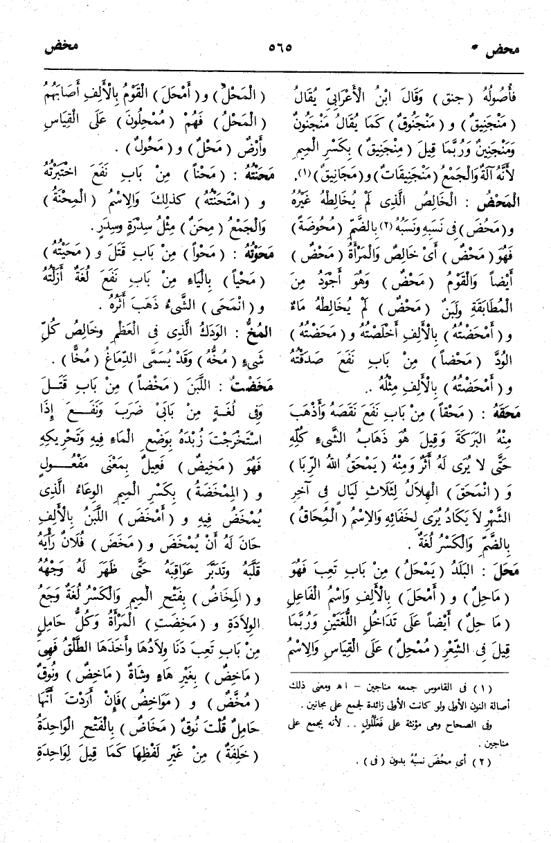 (م ح ض) : الْمَحْضُ الْخَالِصُ الَّذِي لَمْ يُخَالِطْهُ غَيْرُهُ وَمَحُضَ فِي نَسَبِهِ وَنَسَبُهُ (¬1) بِالضَّمِّ مُحُوضَةً فَهُوَ مَحْضٌ أَيْ خَالِصٌ وَالْمَرْأَةُ مَحْضٌ أَيْضًا وَالْقَوْمُ مَحْضٌ وَهُوَ أَجْوَدُ مِنْ الْمُطَابَقَةِ وَلَبَنٌ مَحْضٌ لَمْ يُخَالِطْهُ مَاءٌ وَأَمْحَضْتَهُ بِالْأَلِفِ أَخْلَصْتُهُ وَمَحَضْتُهُ الْوُدَّ مَحْضًا مِنْ بَابِ نَفَعَ صَدَقْتُهُ وَأَمْحَضْتُهُ بِالْأَلِفِ مِثْلُهُ.