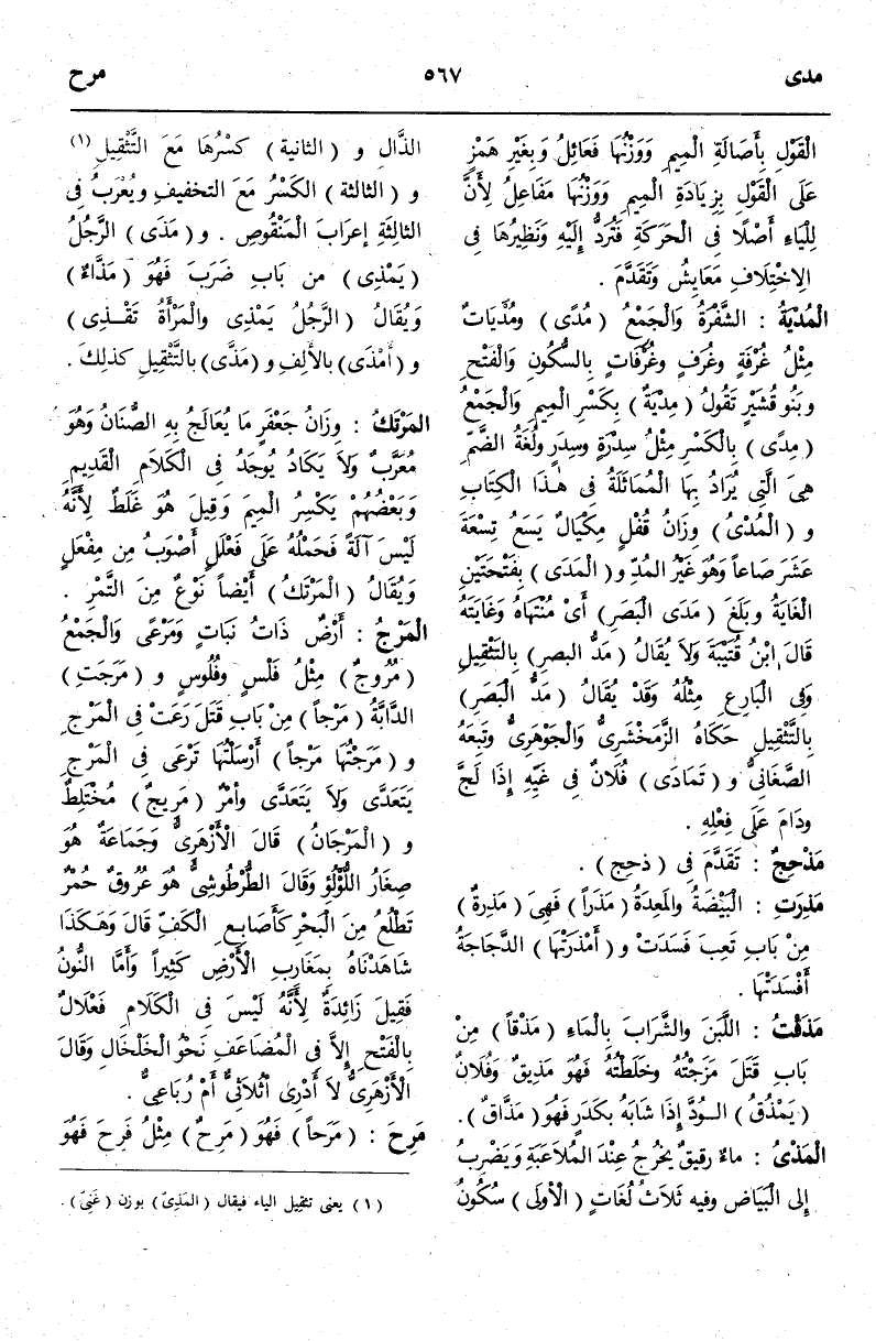 (م ر ج) : الْمَرْجُ أَرْضٌ ذَاتُ نَبَاتٍ وَمَرْعًى وَالْجَمْعُ مُرُوجٌ مِثْلُ فَلْسٍ وَفُلُوسٍ وَمَرَجَتْ الدَّابَّةُ مَرْجًا مِنْ بَابِ قَتَلَ رَعَتْ فِي الْمَرْجِ وَمَرَجْتُهَا مَرْجًا أَرْسَلْتُهَا تَرْعَى فِي الْمَرْجِ يَتَعَدَّى وَلَا يَتَعَدَّى.