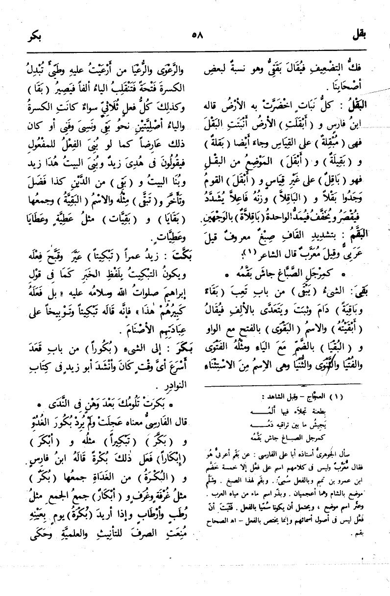 (¬1) العجَّاج- وقبل الشاهد: بطعنة تجلَاء فيها أَلَمُه يَجِيشُ ما بين تراقيه دَمُه كمرجل الصباغ جاش بَقْمُه سأل الجوهرىُّ أستاذه أبا على الفارسى: عن بَقَم أعرابىُّ هُو فقال مُعَرَّبٌ وليس فى كلامهم اسم على فعُل إلا خمسة خَضُم ابن عمرو بن تميم وبالفعل سُمِّى. وبقَم لهذا الصبغ. وشلَّم موضع بالشام وهما أعجميان. وبذَر اسم ماء من مياء العرب. وعثُر اسم موضع، ويحتمل أن يكونا سُمّيا بالفعل. فَثَبَتَ أنّ فَعَّل ليس فى أصول أسمائهم وإنما يختص بالفعل- اهـ الصحاح بقم.