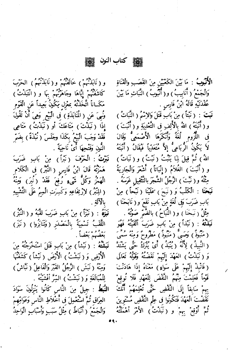 -[591]- نَبَاطِيٌّ بِزِيَادَةِ أَلِفٍ وَالنُّونُ تُضَمُّ وَتُفْتَحُ قَالَ اللَّيْثُ وَرَجُلٌ نَبَطِيٌّ وَمَنَعَهُ ابْنُ الْأَعْرَابِيِّ.