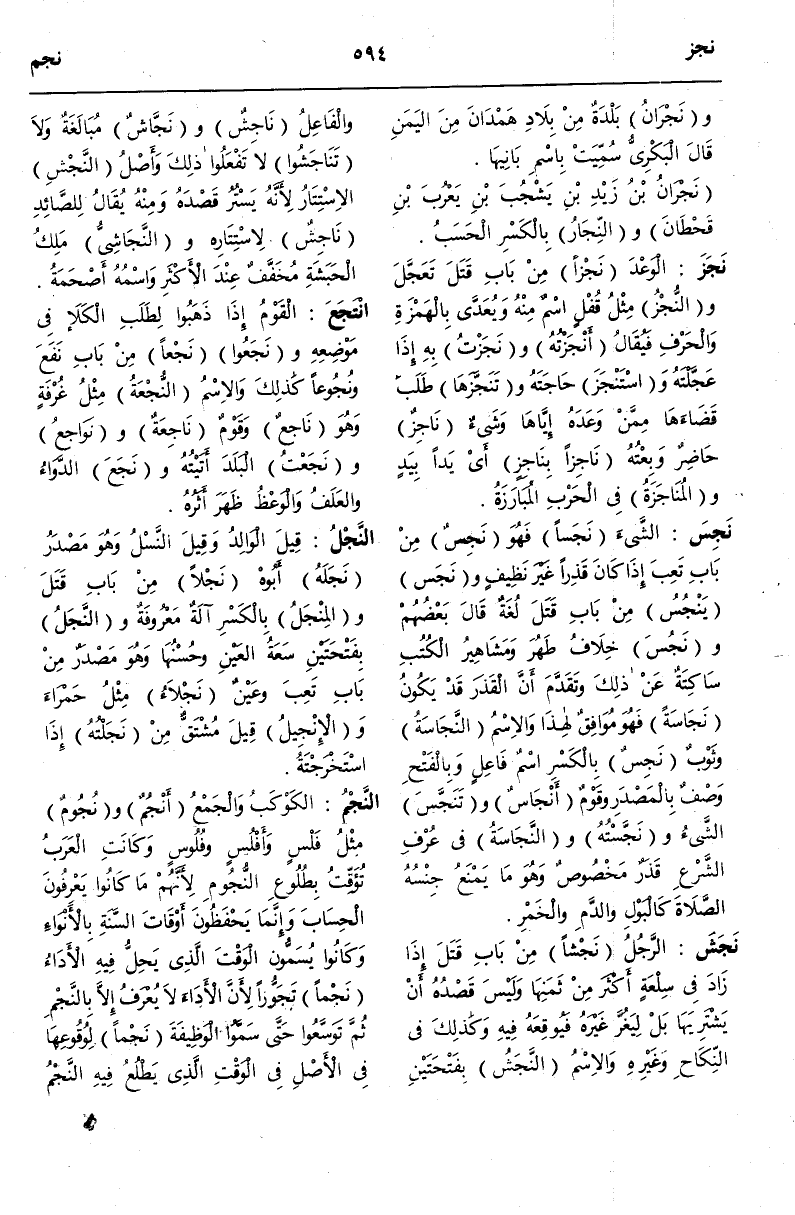 (ن ج م) : النَّجْمُ الْكَوْكَبُ وَالْجَمْعُ أَنْجُمُ وَنُجُومٌ مِثْلُ فَلْسٍ وَأَفْلُسٍ وَفُلُوسٍ وَكَانَتْ الْعَرَبُ تُؤَقِّتُ بِطُلُوعِ النُّجُومِ لِأَنَّهُمْ مَا كَانُوا يَعْرِفُونَ الْحِسَابَ وَإِنَّمَا يَحْفَظُونَ أَوْقَاتَ السَّنَةِ بِالْأَنْوَاءِ وَكَانُوا يُسَمُّونَ الْوَقْتَ الَّذِي يَحِلُّ فِيهِ الْأَدَاءُ نَجْمًا تَجَوُّزًا لِأَنَّ الْأَدَاءَ لَا يُعْرَفُ إلَّا بِالنَّجْمِ ثُمَّ تَوَسَّعُوا حَتَّى سَمَّوْا الْوَظِيفَةَ نَجْمًا لِوُقُوعِهَا فِي الْأَصْلِ فِي الْوَقْتِ الَّذِي يَطْلُعُ فِيهِ النَّجْمُ