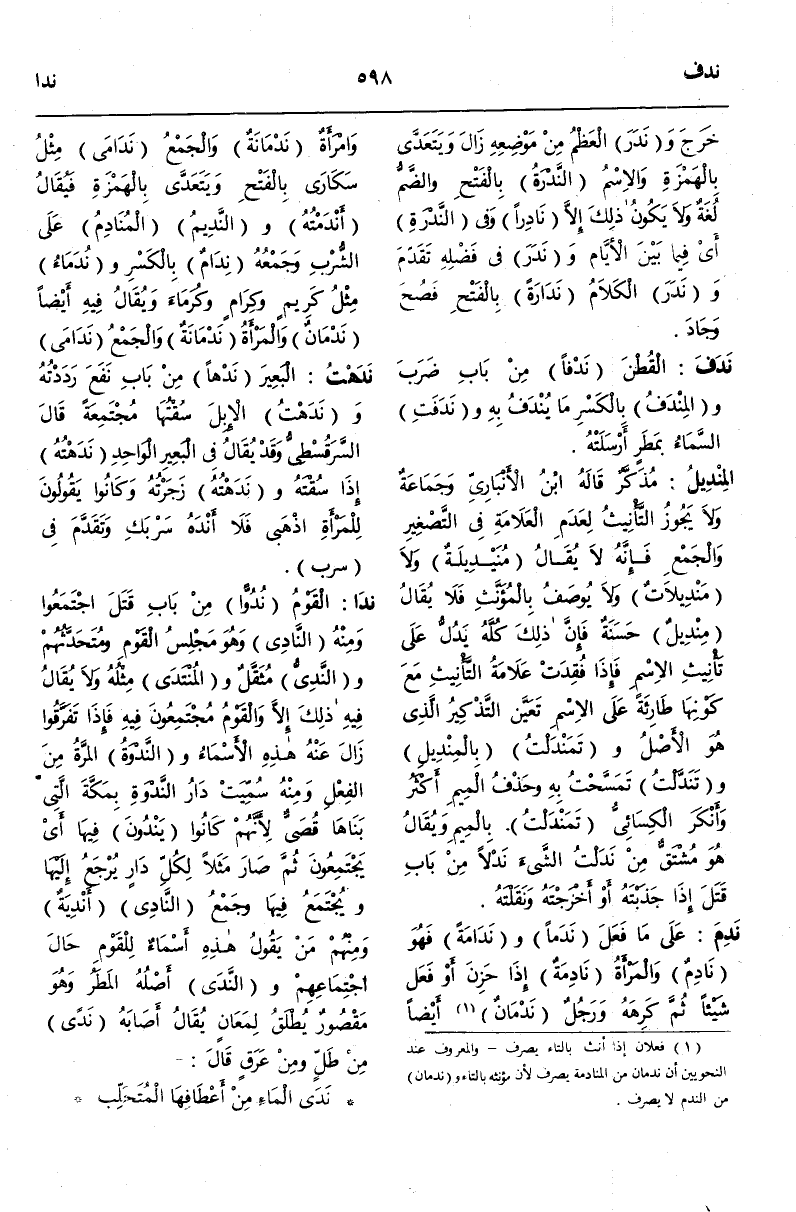 (ن د و) : نَدَا الْقَوْمُ نُدُوًّا مِنْ بَابِ قَتَلَ اجْتَمَعُوا وَمِنْهُ النَّادِي وَهُوَ مَجْلِسُ الْقَوْمِ وَمُتَحَدَّثُهُمْ وَالنَّدِيُّ مُثَقَّلٌ وَالْمُنْتَدَى مِثْلُهُ وَلَا يُقَالُ فِيهِ ذَلِكَ إلَّا وَالْقَوْمُ مُجْتَمِعُونَ فِيهِ فَإِذَا تَفَرَّقُوا زَالَ عَنْهُ هَذِهِ الْأَسْمَاءُ.