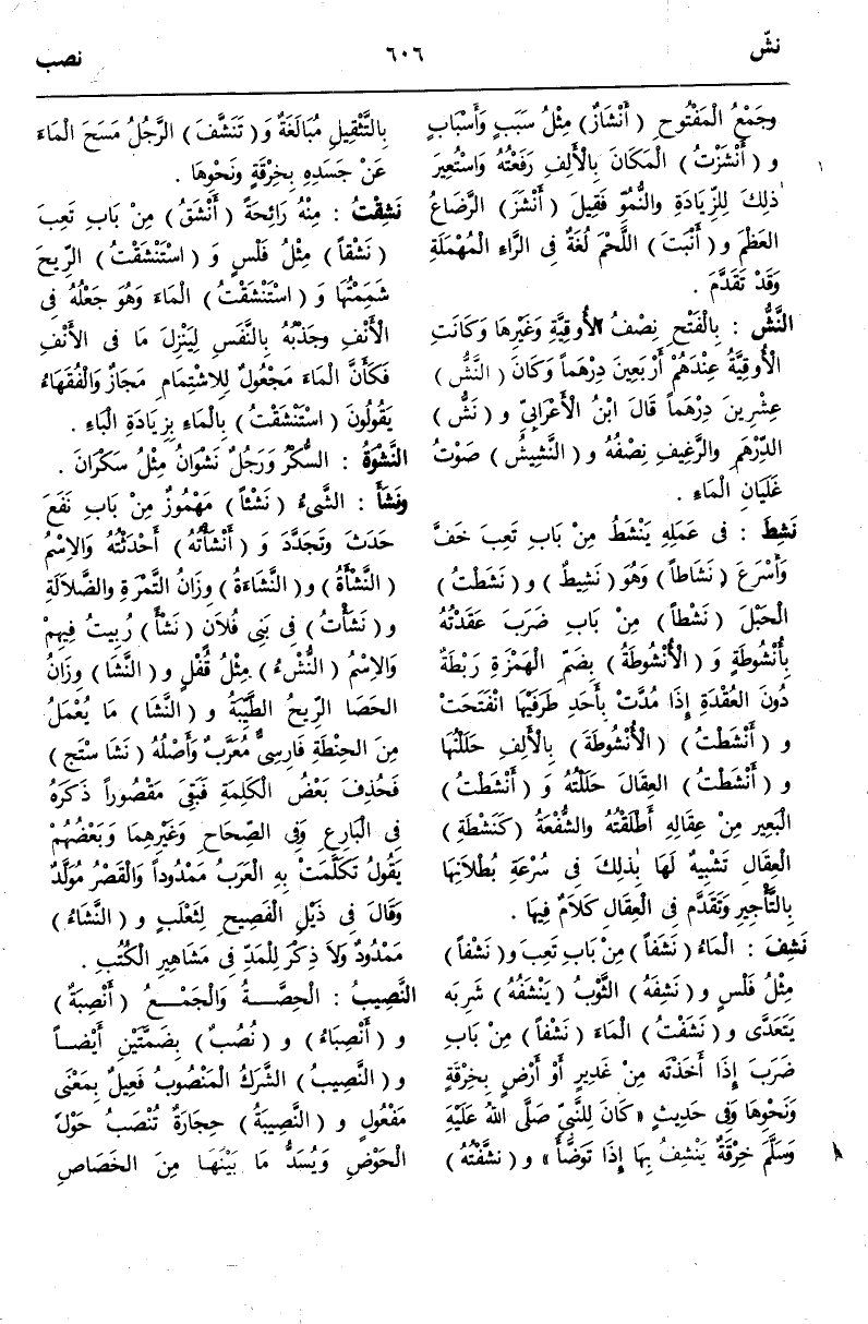 (ن ش ف) : نَشِفَ الْمَاءُ نَشَفًا مِنْ بَابِ تَعِبَ وَنَشْفًا مِثْلُ فَلْسٍ وَنَشِفَهُ الثَّوْبُ يَنْشَفُهُ شَرِبَهُ يَتَعَدَّى وَلَا يَتَعَدَّى وَنَشَفْتُ الْمَاءَ نَشْفًا مِنْ بَابِ ضَرَبَ إذَا أَخَذْتَهُ مِنْ غَدِيرٍ أَوْ أَرْضٍ بِخِرْقَةٍ وَنَحْوِهَا.