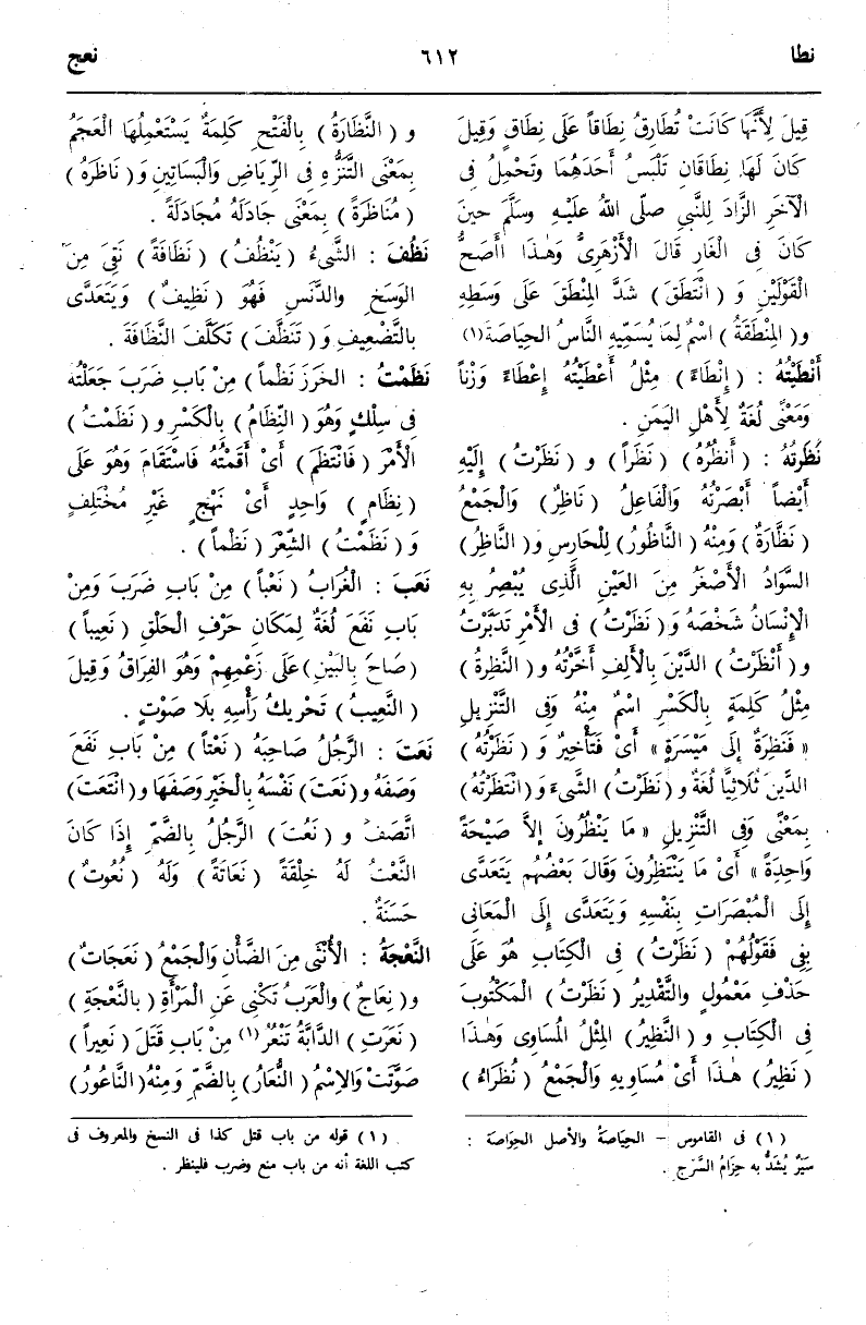 وَالنَّظِيرُ الْمِثْلُ الْمُسَاوِي وَهَذَا نَظِيرُ هَذَا أَيْ مُسَاوِيهِ وَالْجَمْعُ نُظَرَاءُ وَالنَّظَارَةُ بِالْفَتْحِ كَلِمَةٌ يَسْتَعْمِلُهَا الْعَجَمُ بِمَعْنَى التَّنَزُّهِ فِي الرِّيَاضِ وَالْبَسَاتِينِ.