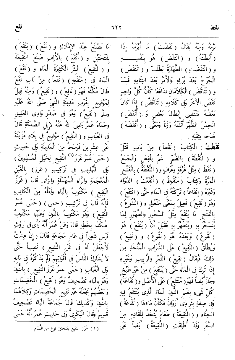 وَالنَّقِيعُ الْبِئْرُ الْكَثِيرَةُ الْمَاءِ وَنَقَعَ الْمَاءُ فِي مَنْقَعِهِ نَقْعًا مِنْ بَابِ نَفَعَ طَالَ مُكْثُهُ فَهُوَ نَاقِعٌ وَنَقِيعٌ وَمِنْهُ قِيلَ لِمَوْضِعٍ بِقُرْبِ مَدِينَةِ النَّبِيِّ - صَلَّى اللهُ عَلَيْهِ وَسَلَّمَ - نَقِيعٌ وَهُوَ فِي صَدْرِ وَادِي الْعَقِيقِ وَحَمَاهُ عُمَرُ لِإِبِلِ الصَّدَقَةِ قَالَ فِي الْعُبَابِ.