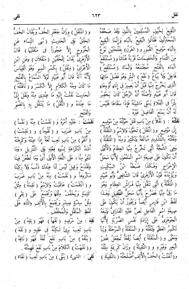 -[624]- بِالْفَتْحِ وَالْمَدِّ وَنَقَاوَةً بِالْفَتْحِ نَظُفَ فَهُوَ نَقِيٌّ عَلَى فَعِيلٍ وَيُعَدَّى بِالْهَمْزَةِ وَالتَّضْعِيفِ وَالنِّقْوُ وِزَانُ حِمْلٍ كُلُّ عَظْمٍ ذِي مُخٍّ وَالْجَمْعُ أَنْقَاءٌ مِثْلُ أَحْمَالٍ وَهِيَ الْقَصَبُ.