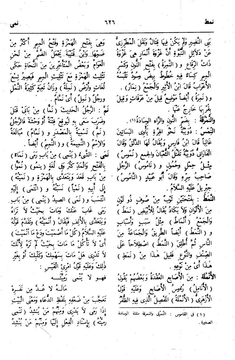 وَالنَّمَطُ أَيْضًا الطَّرِيقُ وَالْجَمَاعَةُ مِنْ النَّاسِ ثُمَّ أُطْلِقَ النَّمَطُ اصْطِلَاحًا عَلَى الصِّنْفِ وَالنَّوْعِ فَقِيلَ هَذَا مِنْ نَمَطِ هَذَا أَيْ مِنْ نَوْعِهِ