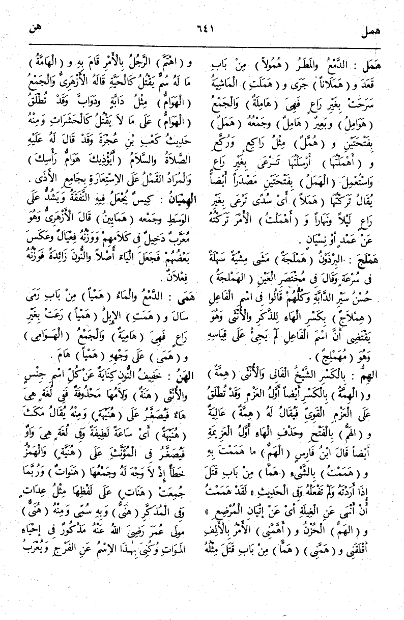 وَهَمَلَتْ الْمَاشِيَةُ سَرَحَتْ بِغَيْرِ رَاعٍ فَهِيَ هَامِلَةٌ وَالْجَمْعُ هَوَامِلُ وَبَعِيرٌ هَامِلٌ وَجَمْعُهُ هَمَلٌ بِفَتْحَتَيْنِ وَهُمَّلٌ مِثْلُ رَاكِعٍ وَرُكَّعٍ وَأَهْمَلْتُهَا أَرْسَلْتُهَا تَرْعَى بِغَيْرِ رَاعٍ وَاسْتُعْمِلَ الْهَمَلُ بِفَتْحَتَيْنِ مَصْدَرًا أَيْضًا يُقَالُ تَرَكْتُهَا هَمَلًا أَيْ سُدًى تَرْعَى بِغَيْرِ رَاعٍ لَيْلًا وَنَهَارًا وَأَهْمَلْتُ الْأَمْرَ تَرَكْتُهُ عَنْ عَمْدٍ أَوْ نِسْيَانٍ.
