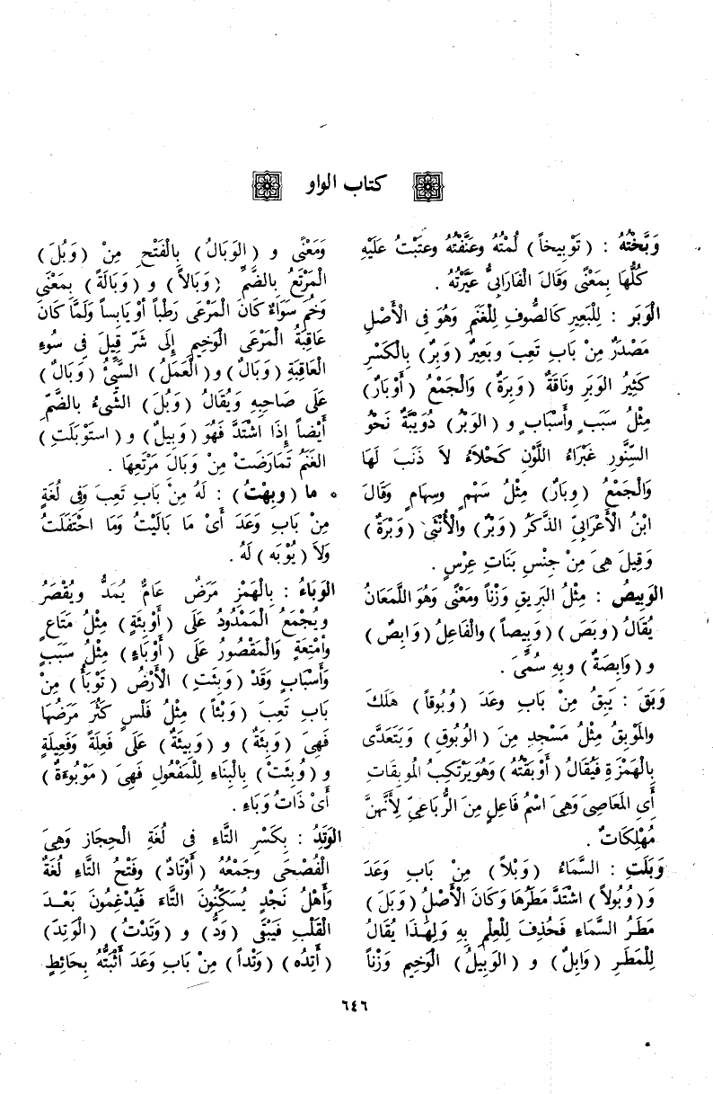 (وبء) : الْوَبَاءُ بِالْهَمْزِ مَرَضٌ عَامٌّ يُمَدُّ وَيُقْصَرُ وَيُجْمَعُ الْمَمْدُودُ عَلَى أَوْبِئَةٍ مِثْلُ مَتَاعٍ وَأَمْتِعَةٍ وَالْمَقْصُورُ عَلَى أَوْبَاءٍ مِثْلُ سَبَبٍ وَأَسْبَابٍ وَقَدْ وَبِئَتْ الْأَرْضُ تَوْبَأُ مِنْ بَابِ تَعِبَ وَبْئًا مِثْلُ فَلْسٍ كَثُرَ مَرَضُهَا فَهِيَ وَبِئَةٌ وَوَبِيئَةٌ عَلَى فَعِلَةٍ وَفَعِيلَةٍ وَوُبِئَتْ بِالْبِنَاءِ لِلْمَفْعُولِ فَهِيَ مَوْبُوءَةٌ أَيْ ذَاتُ وَبَاءٍ.