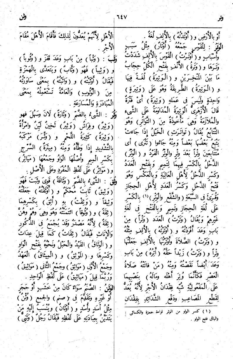 وَالْوِتْرُ الْفَرْدُ وَالْوِتْرُ الذَّحْلُ بِالْكَسْرِ فِيهِمَا لِتَمِيمٍ وَبِفَتْحِ الْعَدَدِ وَكَسْرِ الذَّحْلِ لِأَهْلِ الْعَالِيَةِ وَبِالْعَكْسِ وَهُوَ فَتْحُ الذَّحْلِ وَكَسْرُ الْعَدَدِ لِأَهْلِ الْحِجَازِ وَقُرِئَ فِي السَّبْعَةِ {وَالشَّفْعِ وَالْوَتْرِ} (¬1) [الفجر: 3] بِالْكَسْرِ عَلَى لُغَةِ الْحِجَازِ وَتَمِيمٍ وَبِالْفَتْحِ فِي لُغَةِ غَيْرِهِمْ وَيُقَالُ وَتَرْتُ الْعَدَدَ وَتْرًا مِنْ بَابِ وَعَدَ أَفْرَدْتُهُ وَأَوْتَرْتُهُ بِالْأَلِفِ مِثْلُهُ وَوَتَرْتُ الصَّلَاةَ وَأَوْتَرْتُهَا بِالْأَلِفِ جَعَلْتُهَا وِتْرًا.