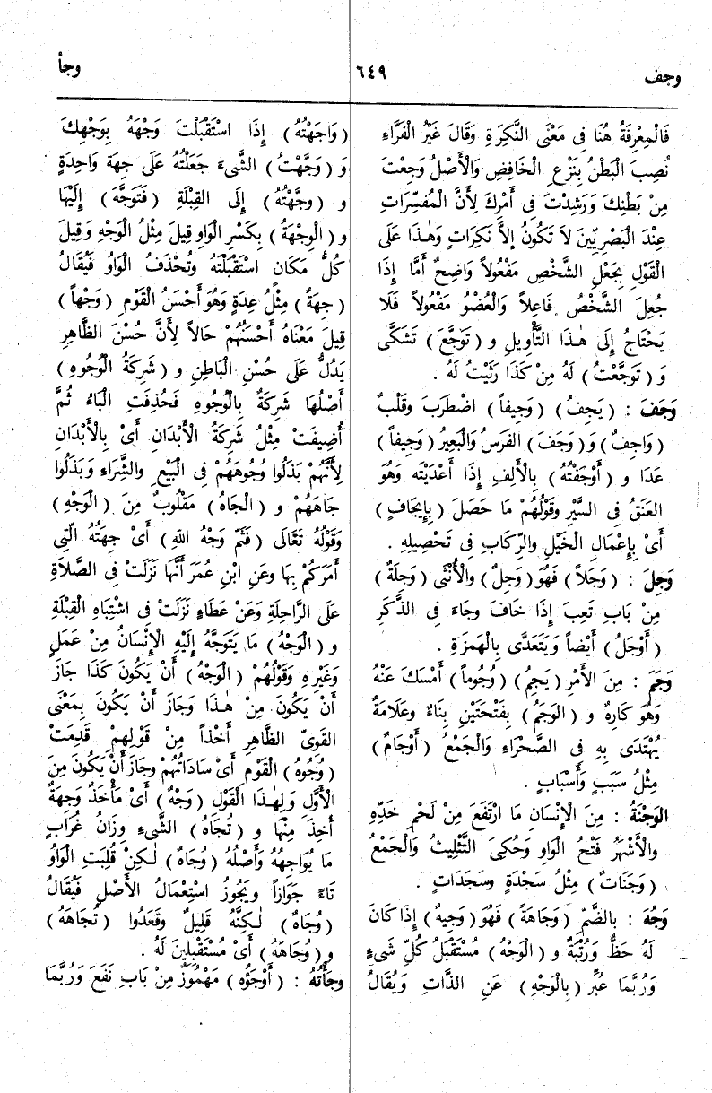 (وج هـ) : وَجُهَ بِالضَّمِّ وَجَاهَةً فَهُوَ وَجِيهٌ إذَا كَانَ لَهُ حَظٌّ وَرُتْبَةٌ وَالْوَجْهُ مُسْتَقْبَلُ كُلِّ شَيْءٍ وَرُبَّمَا عُبِّرَ بِالْوَجْهِ عَنْ الذَّاتِ وَيُقَالُ وَاجَهْتُهُ إذَا اسْتَقْبَلْتَ وَجْهَهُ بِوَجْهِكَ وَوَجَّهْتُ الشَّيْءَ جَعَلْتُهُ عَلَى جِهَةٍ وَاحِدَةٍ وَوَجَّهْتُهُ إلَى الْقِبْلَةِ فَتَوَجَّهَ إلَيْهَا وَالْوِجْهَةُ بِكَسْرِ الْوَاوِ قِيلَ مِثْلُ الْوَجْهِ وَقِيلَ كُلُّ مَكَان اسْتَقْبَلْتَهُ وَتُحْذَفُ الْوَاوُ فَيُقَالُ جِهَةٌ مِثْلُ عِدَةٍ وَهُوَ أَحْسَنُ الْقَوْمِ وَجْهًا قِيلَ مَعْنَاهُ أَحْسَنُهُمْ حَالًا لِأَنَّ حُسْنَ الظَّاهِرِ يَدُلُّ عَلَى حُسْنِ الْبَاطِنِ