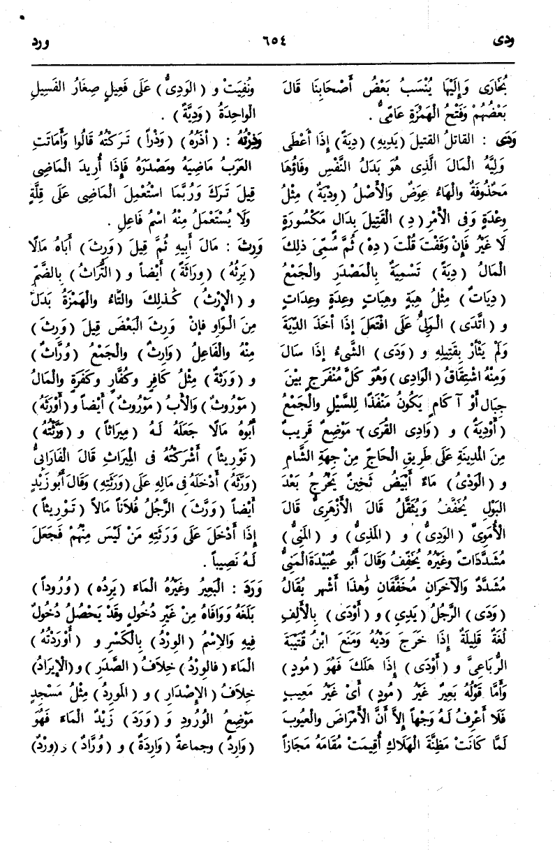 -[655]- تَسْمِيَةٌ بِالْمَصْدَرِ وَالْجَمْعُ دِيَاتٌ مِثْلُ هِبَةٍ وَهِبَاتٍ وَعِدَةٍ وَعِدَاتٍ وَاتَّدَى الْوَلِيُّ عَلَى افْتَعَلَ إذَا أَخَذَ الدِّيَةَ وَلَمْ يَثْأَرْ بِقَتِيلِهِ وَوَدَى الشَّيْءُ إذَا سَالَ وَمِنْهُ اشْتِقَاقُ.