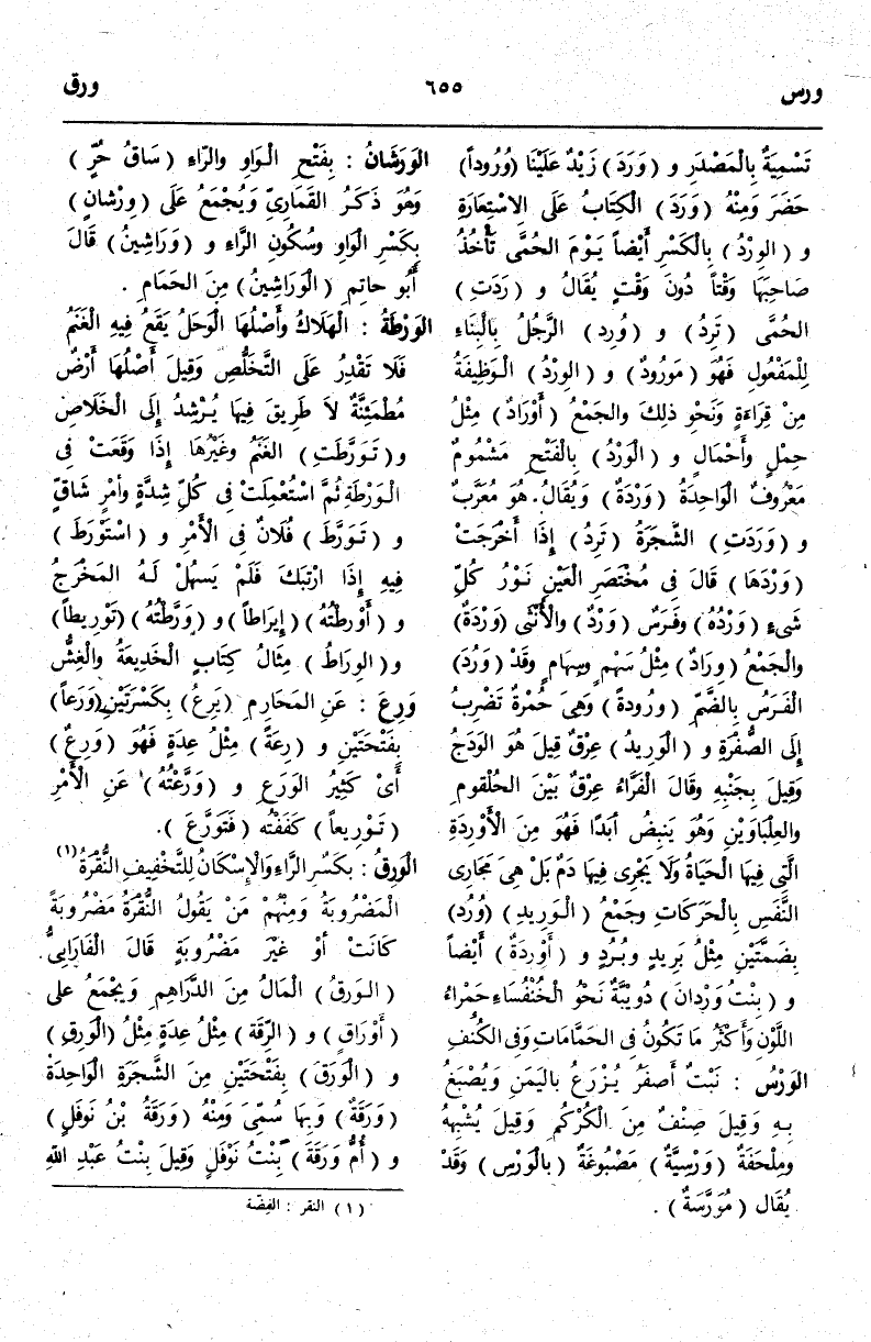(ور س) : الْوَرْسُ نَبْتٌ أَصْفَرُ يُزْرَعُ بِالْيَمَنِ وَيُصْبَغُ بِهِ وَقِيلَ صِنْفٌ مِنْ الْكُرْكُمِ وَقِيلَ يُشْبِهُهُ وَمِلْحَفَةٌ وَرْسِيَّةٌ مَصْبُوغَةٌ بِالْوَرْسِ وَقَدْ يُقَال مُوَرَّسَةٌ.