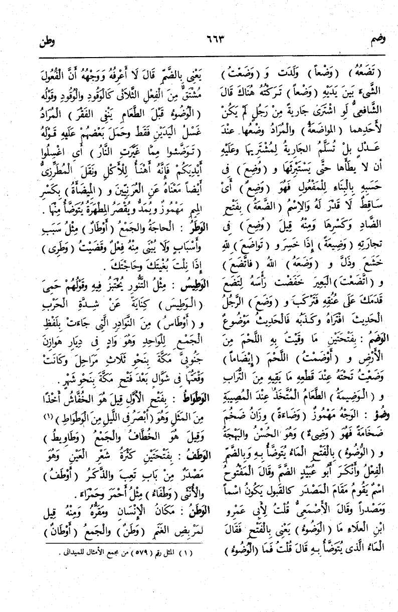 وَقَالَ الْأَصْمَعِيُّ: قُلْتُ لِأَبِي عَمْرِو بْنِ الْعَلَاءِ مَا الْوَضُوءُ يَعْنِي بِالْفَتْحِ فَقَالَ الْمَاءُ الَّذِي يُتَوَضَّأُ بِهِ قَالَ قُلْتُ فَمَا الْوُضُوءُ يَعْنِي بِالضَّمِّ قَالَ لَا أَعْرِفُهُ وَوَجْهُهُ أَنَّ الْفُعُولَ مُشْتَقٌّ مِنْ الْفِعْلِ الثُّلَاثِيِّ كَالْوَقُودِ وَقَوْلُهُ الْوُضُوءُ قَبْلَ الطَّعَامِ يَنْفِي الْفَقْرَ الْمُرَادُ غَسْلُ الْيَدَيْنِ فَقَطْ وَحَمَلَ بَعْضُهُمْ عَلَيْهِ قَوْلَهُ تَوَضَّئُوا مِمَّا غَيَّرَتْ النَّارُ أَيْ اغْسِلُوا أَيْدِيَكُمْ فَإِنَّهُ أَهْنَأُ لِلْأَكْلِ وَنَقَلَ الْمُطَرِّزِيُّ أَيْضًا مَعْنَاهُ عَنْ الْعُرَنِيِّينَ وَالْمِيضَأَةُ بِكَسْرِ الْمِيمِ مَهْمُوزٌ وَيُمَدُّ وَيُقْصَرُ الْمِطْهَرَةُ يُتَوَضَّأُ مِنْهَا.
