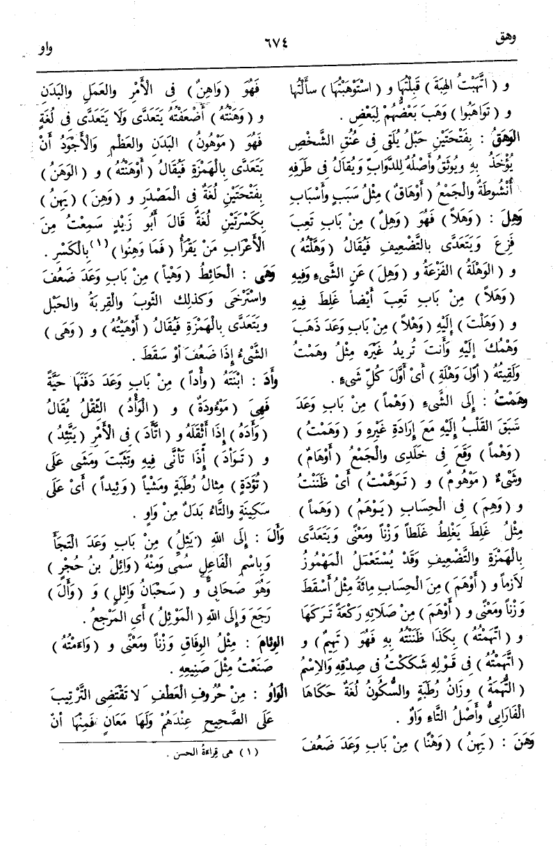 (وهـ ن) : وَهَنَ يَهِنُ وَهْنًا مِنْ بَابِ وَعَدَ ضَعُفَ فَهُوَ وَاهِنٌ فِي الْأَمْرِ وَالْعَمَلِ وَالْبَدَنِ وَوَهَنْتُهُ أَضْعَفْتُهُ يَتَعَدَّى وَلَا يَتَعَدَّى فِي لُغَةٍ فَهُوَ مَوْهُونُ الْبَدَنِ وَالْعَظْمِ وَالْأَجْوَدُ أَنْ يَتَعَدَّى بِالْهَمْزَةِ فَيُقَالُ أَوْهَنْتُهُ وَالْوَهَنُ بِفَتْحَتَيْنِ لُغَةٌ فِي الْمَصْدَرِ وهن يَهِنُ بِكَسْرَتَيْنِ لُغَةٌ قَالَ أَبُو زَيْدٍ سَمِعْتُ مِنْ الْأَعْرَابِ مَنْ يَقْرَأُ فَمَا وَهِنُوا (¬1) بِالْكَسْرِ.