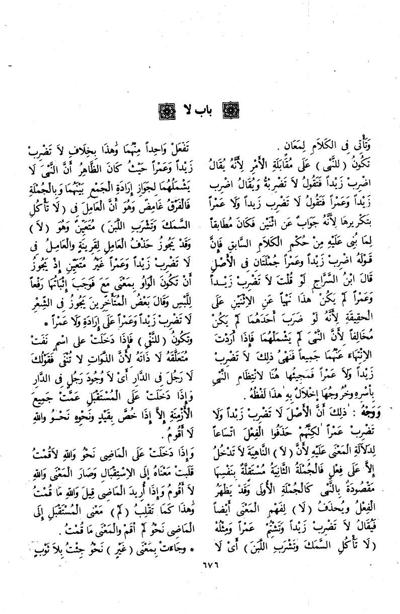 وَتَأْتِي فِي الْكَلَامِ لِمَعَانٍ تَكُونُ لِلنَّهْيِ عَلَى مُقَابَلَةِ الْأَمْرِ لِأَنَّهُ يُقَالُ اضْرِبْ زَيْدًا فَتَقُولُ لَا تَضْرِبْهُ وَيُقَالُ اضْرِبْ زَيْدًا وَعَمْرًا فَتَقُولُ لَا تَضْرِبْ زَيْدًا وَلَا عَمْرًا بِتَكْرِيرِهَا لِأَنَّهُ جَوَابٌ عَنْ اثْنَيْنِ فَكَانَ مُطَابِقًا لِمَا بُنِيَ عَلَيْهِ مِنْ حُكْمِ الْكَلَامِ السَّابِقِ فَإِنَّ قَوْلَهُ اضْرِبْ زَيْدًا وَعَمْرًا جُمْلَتَانِ فِي الْأَصْلِ قَالَ ابْنُ السَّرَّاجِ لَوْ قُلْتَ لَا تَضْرِبْ زَيْدًا وَعَمْرًا لَمْ يَكُنْ هَذَا نَهْيًا عَنْ الِاثْنَيْنِ عَلَى الْحَقِيقَةِ لِأَنَّهُ لَوْ ضَرَبَ أَحَدَهُمَا لَمْ يَكُنْ مُخَالِفًا لِأَنَّ النَّهْيَ لَمْ يَشْمَلْهُمَا فَإِذَا أَرَدْتَ الِانْتِهَاءَ عَنْهُمَا جَمِيعًا فَنَهْيُ ذَلِكَ لَا تَضْرِبْ زَيْدًا وَلَا عَمْرًا فَمَجِيئُهَا هُنَا لِانْتِظَامِ النَّهْيِ بِأَسْرِهِ وَخُرُوجُهَا إخْلَالٌ بِهِ هَذَا لَفْظُهُ وَوَجْهُ ذَلِكَ أَنَّ الْأَصْلَ لَا تَضْرِبْ زَيْدًا وَلَا تَضْرِبْ عَمْرًا لَكِنَّهُمْ حَذَفُوا الْفِعْلَ اتِّسَاعًا لِدَلَالَةِ الْمَعْنَى عَلَيْهِ لِأَنَّ لَا النَّاهِيَةَ لَا تَدْخُلُ إلَّا عَلَى فِعْلٍ فَالْجُمْلَةُ الثَّانِيَةُ مُسْتَقِلَّةٌ بِنَفْسِهَا مَقْصُودَةٌ بِالنَّهْيِ كَالْجُمْلَةِ الْأُولَى وَقَدْ يَظْهَرُ الْفِعْلُ وَيُحْذَفُ لَا لِفَهْمِ الْمَعْنَى أَيْضًا فَيُقَالُ لَا تَضْرِبْ زَيْدًا وَتَشْتُمْ عَمْرًا وَمِثْلُهُ لَا تَأْكُلْ السَّمَكَ وَتَشْرَبْ اللَّبَنَ أَيْ لَا تَفْعَلْ وَاحِدًا مِنْهُمَا وَهَذَا بِخِلَافِ لَا تَضْرِبْ زَيْدًا وَعَمْرًا حَيْثُ كَانَ الظَّاهِرُ أَنَّ النَّهْيَ لَا يَشْمَلُهُمَا لِجَوَازِ إرَادَةِ الْجَمْعِ بَيْنَهُمَا وَبِالْجُمْلَةِ فَالْفَرْقُ غَامِضٌ وَهُوَ أَنَّ الْعَامِلَ فِي لَا تَأْكُلْ السَّمَكَ وَتَشْرَبْ اللَّبَنَ مُتَعَيِّنٌ وَهُوَ لَا وَقَدْ يَجُوزُ حَذْفُ الْعَامِلِ لِقَرِينَةٍ وَالْعَامِلُ فِي لَا تَضْرِبْ زَيْدًا وَعَمْرًا غَيْرُ مُتَعَيِّنٍ إذْ يَجُوزُ أَنْ تَكُونَ الْوَاوُ بِمَعْنَى مَعَ فَوَجَبَ إثْبَاتُهَا رَفْعًا لِلَّبْسِ.