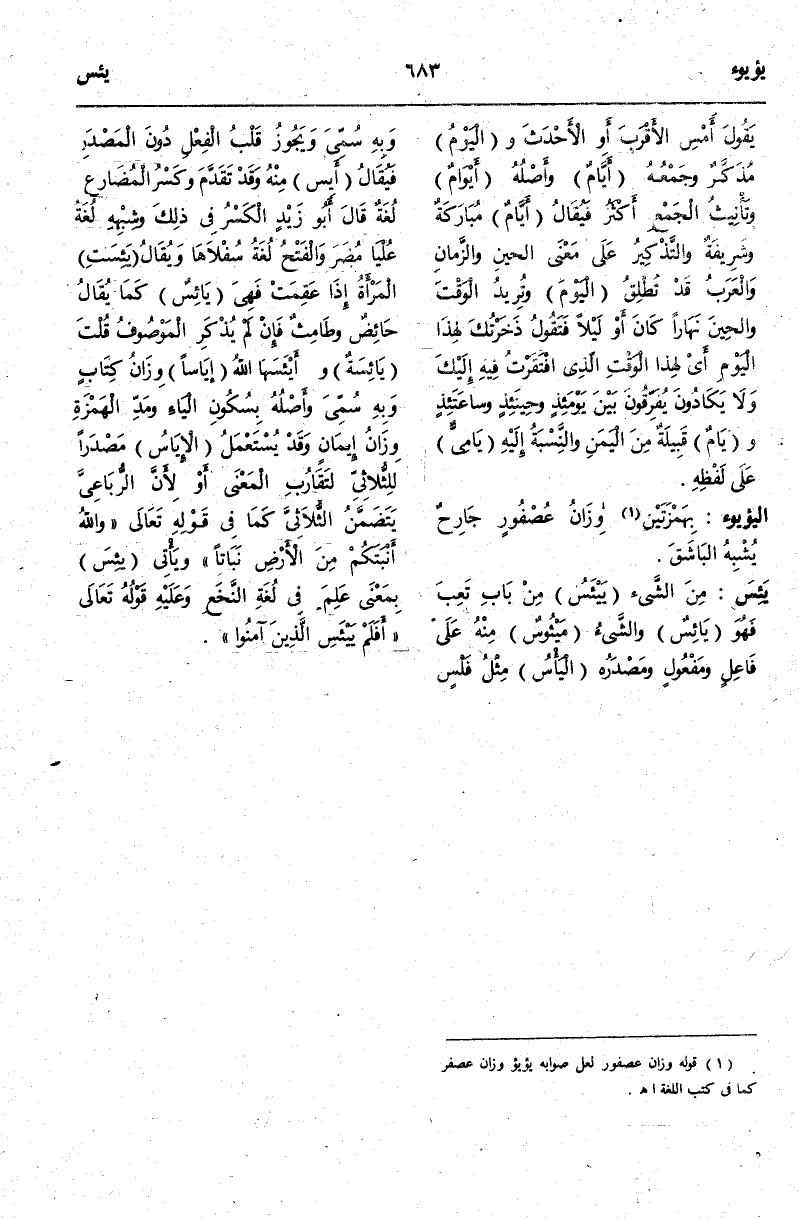(يء س) : يَئِسَ مِنْ الشَّيْءِ يَيْأَسُ مِنْ بَابِ تَعِبَ فَهُوَ يَائِسٌ وَالشَّيْءُ مَيْئُوسٌ مِنْهُ عَلَى فَاعِلٍ وَمَفْعُولٍ وَمَصْدَرُهُ الْيَأْسُ مِثْلُ فَلْسٍ وَبِهِ سُمِّيَ وَيَجُوزُ قَلْبُ الْفِعْلِ دُونَ الْمَصْدَرِ فَيُقَالُ أَيِسَ مِنْهُ وَقَدْ تَقَدَّمَ وَكَسْرُ الْمُضَارِعِ لُغَةٌ قَالَ أَبُو زَيْدٍ الْكَسْرُ فِي ذَلِكَ وَشِبْهِهِ لُغَةُ عُلْيَا مُضَرَ وَالْفَتْحُ لُغَةُ سُفْلَاهَا وَيُقَالُ يَئِسَتْ الْمَرْأَةُ إذَا عَقِمَتْ فَهِيَ يَائِسٌ كَمَا يُقَالُ حَائِضٌ وَطَامِثٌ فَإِنْ لَمْ يُذْكَرْ الْمَوْصُوفُ قُلْتَ يَائِسَةٌ وَأَيْئَسَهَا اللَّهُ إيَاسًا وِزَانُ كِتَابٍ وَبِهِ سُمِّيَ وَأَصْلُهُ بِسُكُونِ الْيَاءِ وَمَدِّ الْهَمْزَةِ وِزَانُ إيمَانٍ وَقَدْ يُسْتَعْمَلُ الْإِيَاسُ مَصْدَرًا لِلثُّلَاثِيِّ لِتَقَارُبِ الْمَعْنَى أَوْ لِأَنَّ الرُّبَاعِيَّ يَتَضَمَّنُ الثُّلَاثِيَّ كَمَا فِي قَوْله تَعَالَى {وَاللَّهُ أَنْبَتَكُمْ مِنَ الأَرْضِ نَبَاتًا} [نوح: 17] وَيَأْتِي يَئِسَ بِمَعْنَى عَلِمَ فِي لُغَةِ النَّخَعِ وَعَلَيْهِ قَوْله تَعَالَى {أَفَلَمْ يَيْأَسِ الَّذِينَ آمَنُوا} [الرعد: 31] .