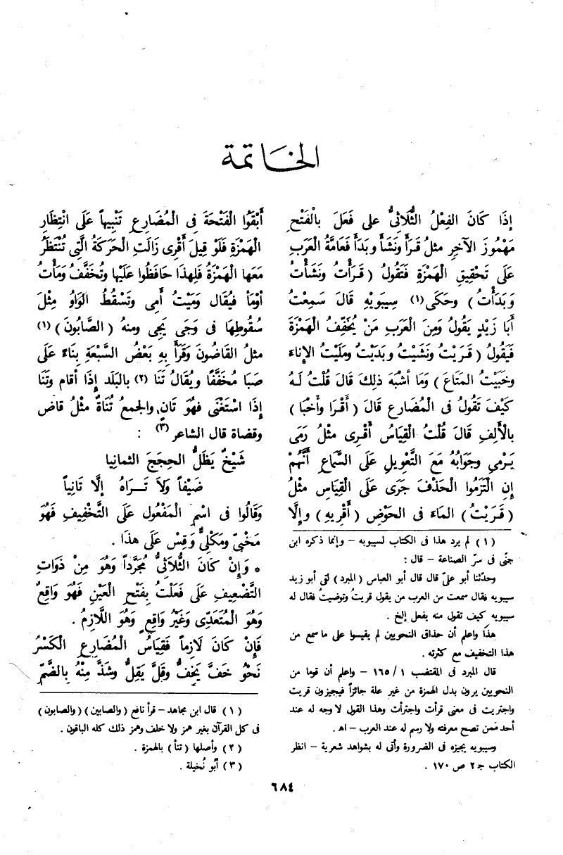 إذَا كَانَ الْفِعْلُ الثُّلَاثِيُّ عَلَى فَعَلَ بِالْفَتْحِ مَهْمُوزَ الْآخِرِ مِثْلَ قَرَأَ وَنَشَأَ وَبَدَأَ فَعَامَّةُ الْعَرَبِ عَلَى تَحْقِيقِ الْهَمْزَةِ فَتَقُولُ قَرَأْتُ وَنَشَأْتُ وَبَدَأْتُ وَحَكَى (¬1) سِيبَوَيْهِ قَالَ سَمِعْتُ أَبَا زَيْدٍ يَقُولُ وَمِنْ الْعَرَبِ مَنْ يُخَفِّفُ الْهَمْزَةَ فَيَقُولُ قَرَيْتُ وَنَشَيْتُ وَبَدَيْتُ وَمَلَيْتُ الْإِنَاءَ وَخَبَيْتُ الْمَتَاعَ وَمَا أَشْبَهَ ذَلِكَ قَالَ قُلْتُ لَهُ كَيْفَ تَقُولُ فِي الْمُضَارِعِ قَالَ أَقْرَا وَأَخْبَا بِالْأَلِفِ قَالَ قُلْتُ الْقِيَاسُ أَقْرِي مِثْلُ رَمَى يَرْمِي وَجَوَابُهُ مَعَ التَّعْوِيلِ عَلَى السَّمَاعِ أَنَّهُمْ إنْ الْتَزَمُوا الْحَذْفَ جَرَى عَلَى الْقِيَاسِ مِثْلُ قَرَيْتُ الْمَاءَ فِي الْحَوْضِ أَقْرِيهِ وَإِلَّا أَبْقَوْا الْفَتْحَةَ فِي الْمُضَارِعِ تَنْبِيهًا عَلَى انْتِظَارِ الْهَمْزَةِ فَلَوْ قِيلَ أَقْرِي زَالَتْ الْحَرَكَةُ الَّتِي تُنْتَظَرُ مَعَهَا الْهَمْزَةُ فَلِهَذَا حَافَظُوا عَلَيْهَا وَتُخَفَّفُ وَمَأْتُ أَوْمَأُ فَيُقَالُ وَمَيْتُ أَمِي وَتَسْقُطُ الْوَاوُ مِثْلَ سُقُوطِهَا فِي وَجَى يَجِي وَمِنْهُ الصَّابُونَ (¬2) مِثْلُ الْقَاضُونَ وَقَرَأَ بِهِ بَعْضُ السَّبْعَةِ بِنَاءً عَلَى صَبَا مُخَفَّفًا وَيُقَالُ تَنَا (¬3) بِالْبَلَدِ إذَا أَقَامَ وَتَنَا إذَا اسْتَغْنَى فَهُوَ تَانٍ وَالْجَمْعُ تُنَاةٌ مِثْلُ قَاضٍ وَقُضَاةٍ قَالَ الشَّاعِرُ (¬4)