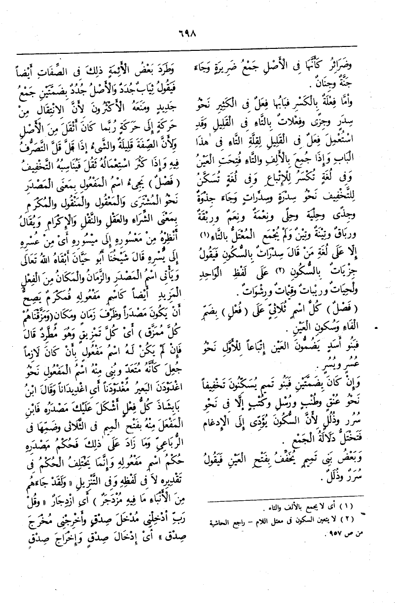 (فَصْلٌ) كُلُّ اسْمٍ ثُلَاثِيٍّ عَلَى فُعْلٍ بِضَمِّ الْفَاءِ وَسُكُونِ الْعَيْنِ فَبَنُو أَسَدٍ يَضُمُّونَ الْعَيْنَ إتْبَاعًا لِلْأَوَّلِ نَحْوُ عُسُرٍ وَيُسُرٍ وَإِنْ كَانَ بِضَمَّتَيْنِ فَبَنُو تَمِيمٍ يُسَكِّنُونَ تَخْفِيفًا نَحْوُ عُنْقٍ وَطُنْبٍ وَرُسْلٍ وَكُتْبٍ إلَّا فِي نَحْوِ سُرُرٍ وَذُلُلٍ لِأَنَّ السُّكُونَ يُؤَدِّي إلَى الْإِدْغَامِ فَتَخْتَلُّ دَلَالَةُ الْجَمْعِ وَبَعْضُ بَنِي تَمِيمٍ يُخَفِّفُ بِفَتْحِ الْعَيْنِ فَيَقُولُ سُرَرٌ وَذُلَلٌ وَطَرَدَ بَعْضُ الْأَئِمَّةِ ذَلِكَ فِي الصِّفَاتِ أَيْضًا فَيَقُولُ ثِيَابٌ جُدَدٌ وَالْأَصْلُ جُدُدٌ بِضَمَّتَيْنِ جَمْعُ جَدِيدٍ وَمَنَعَهُ الْأَكْثَرُونَ لِأَنَّ الِانْتِقَالَ مِنْ حَرَكَةٍ إلَى حَرَكَةٍ رُبَّمَا كَانَ أَثْقَلَ مِنْ الْأَصْلِ وَلِأَنَّ الصِّفَةَ قَلِيلَةٌ وَالشَّيْءُ إذَا قَلَّ قَلَّ التَّصَرُّفُ فِيهِ وَإِذَا كَثُرَ اسْتِعْمَالُهُ ثَقُلَ فَيُنَاسِبُهُ التَّخْفِيفُ.