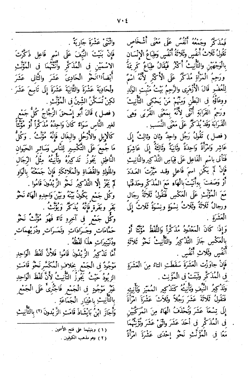 (فَصْلٌ) قَالَ أَبُو إِسْحَاقَ الزَّجَّاجُ كُلُّ جَمْعٍ لِغَيْرِ النَّاسِ سَوَاءٌ كَانَ وَاحِدُهُ مُذَكَّرًا أَوْ مُؤَنَّثًا كَالْإِبِلِ وَالْأَرْحُلِ وَالْبِغَالِ فَإِنَّهُ مُؤَنَّثٌ وَكُلُّ مَا جُمِعَ عَلَى التَّكْسِيرِ لِلنَّاسِ وَسَائِرِ الْحَيَوَانِ النَّاطِقِ يَجُوزُ تَذْكِيرُهُ وَتَأْنِيثُهُ مِثْلُ الرِّجَالِ وَالْمُلُوكِ وَالْقُضَاةِ وَالْمَلَائِكَةِ فَإِنْ جَمَعْتَهُ بِالْوَاوِ لَمْ يَجُزْ إلَّا التَّذْكِيرُ نَحْوُ الزَّيْدُونَ قَامُوا وَكُلُّ جَمْعٍ يَكُونُ بَيْنَهُ وَبَيْنَ وَاحِدِهِ الْهَاءُ نَحْوُ بَقَرٍ وَبَقَرَةٍ فَإِنَّهُ يُذَكَّرُ وَيُؤَنَّثُ وَكُلُّ جَمْعٍ فِي آخِرِهِ تَاءٌ فَهُوَ مُؤَنَّثٌ نَحْوُ حَمَّامَاتٍ وَجَرَادَاتٍ وَتَمَرَاتٍ وَدُرَيْهِمَاتٍ وَدُنَيْنِيرَاتٍ هَذَا لَفْظُهُ، أَمَّا تَذْكِيرُ الزَّيْدُونَ قَامُوا فَلِأَنَّ لَفْظَ الْوَاحِدِ مَوْجُودٌ فِي الْجَمْعِ بِخِلَافِ الْمُكَسَّرِ نَحْوُ قَامَتْ الزُّيُودُ حَيْثُ يَجُوزُ التَّأْنِيثُ لِأَنَّ لَفْظَ الْوَاحِدِ غَيْرُ مَوْجُودٍ فِي الْجَمْعِ فَاجْتُرِئَ عَلَى الْجَمْعِ بِالتَّأْنِيثِ بِاعْتِبَارِ الْجَمَاعَةِ وَأَجَازَ ابْنُ بَابْشَاذْ قَامَتْ الزَّيْدُونَ (¬1) بِالتَّأْنِيثِ