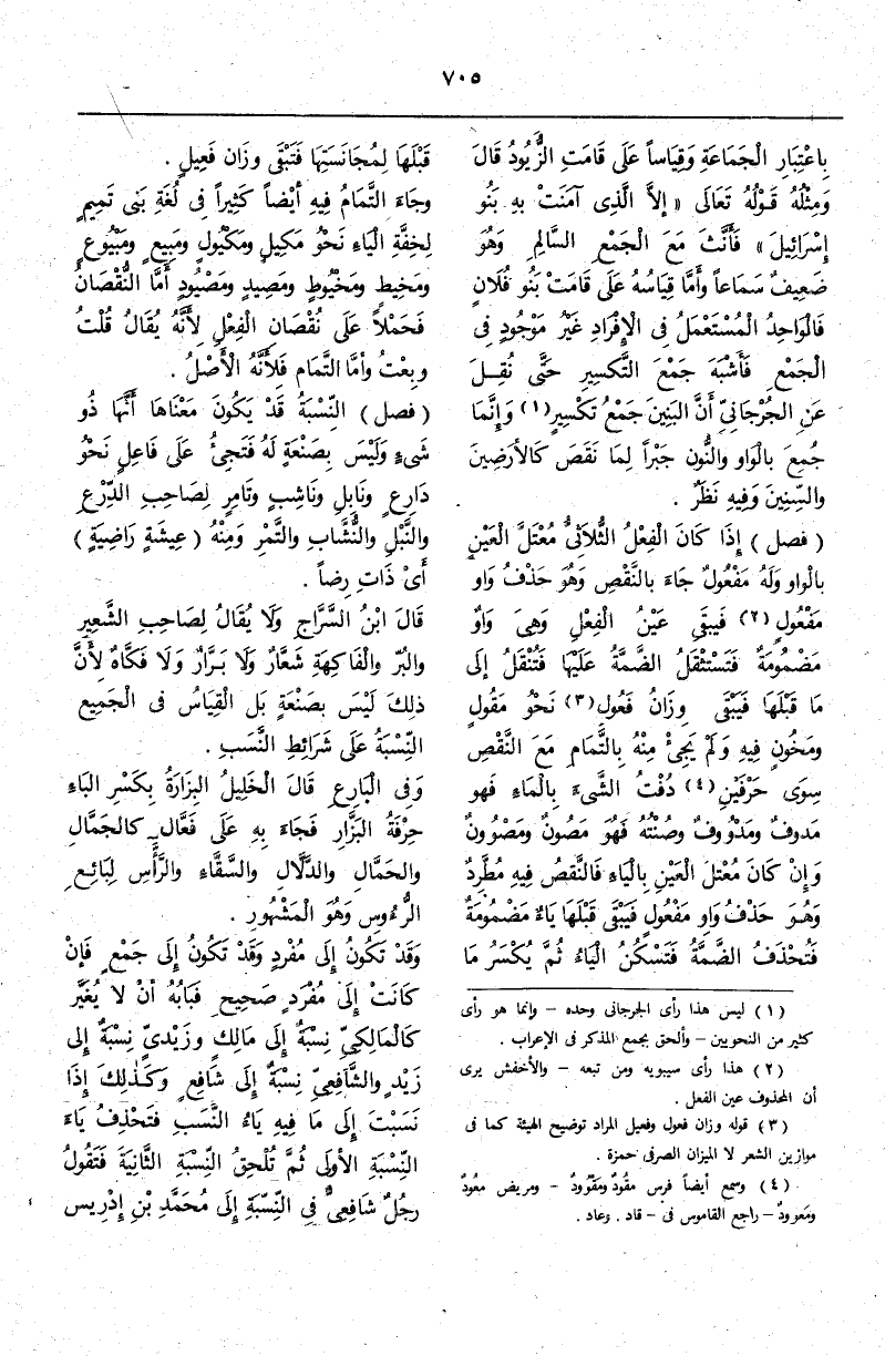 -[706]- وَقَوْلُ الْعَامَّةِ شَفْعَوِيٌّ خَطَأٌ إذْ لَا سَمَاع يُؤَيِّدُهُ وَلَا قِيَاسَ يُعَضِّدُهُ وَفِي النِّسْبَةِ إلَى الْإِبِلِ وَالْمَلِكِ وَالنَّمْرِ وَمَا أَشْبَهَهُ إبِلِّيٌّ وَمَلَكِيٌّ بِفَتْحِ الْوَسَطِ اسْتِيحَاشًا لِتَوَالِي (¬1) حَرَكَاتٍ مَعَ الْيَاءِ،