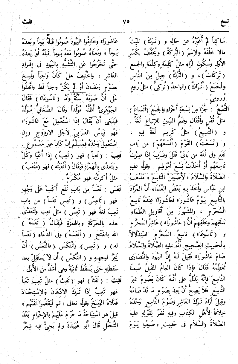 وَقَوْلُهُ - عَلَيْهِ الصَّلَاةُ وَالسَّلَامُ - «لَأَصُومَنَّ التَّاسِعَ» مَذْهَبُ ابْنِ عَبَّاسٍ وَأَخَذَ بِهِ بَعْضُ الْعُلَمَاءِ أَنَّ الْمُرَادَ بِالتَّاسِعِ يَوْمُ عَاشُورَاءَ فَعَاشُورَاءُ عِنْدَهُ تَاسِعُ الْمُحَرَّمِ، وَالْمَشْهُورُ مِنْ أَقَاوِيلِ الْعُلَمَاءِ سَلَفِهِمْ وَخَلَفِهِمْ أَنَّ عَاشُورَاءَ عَاشِرُ الْمُحَرَّمِ وَتَاسُوعَاءَ تَاسِعُ الْمُحَرَّمِ اسْتِدْلَالًا بِالْحَدِيثِ الصَّحِيحِ «أَنَّهُ - عَلَيْهِ الصَّلَاةُ وَالسَّلَامُ - صَامَ عَاشُورَاءَ فَقِيلَ لَهُ إنَّ الْيَهُودَ وَالنَّصَارَى تُعَظِّمُهُ فَقَالَ فَإِذَا كَانَ الْعَامُ الْمُقْبِلُ صُمْنَا التَّاسِعَ» فَإِنَّهُ يَدُلُّ عَلَى أَنَّهُ كَانَ يَصُومُ غَيْرَ التَّاسِعِ فَلَا يَصِحُّ أَنْ يَعِدَ بِصَوْمِ مَا قَدْ صَامَهُ وَقِيلَ أَرَادَ تَرْكَ الْعَاشِرِ وَصَوْمَ التَّاسِعِ وَحْدَهُ خِلَافًا لِأَهْلِ الْكِتَابِ وَفِيهِ نَظَرٌ لِقَوْلِهِ - عَلَيْهِ الصَّلَاةُ وَالسَّلَامُ - فِي حَدِيثٍ «صُومُوا يَوْمَ عَاشُورَاءَ وَخَالِفُوا الْيَهُودَ صُومُوا قَبْلَهُ يَوْمًا وَبَعْدَهُ يَوْمًا» وَمَعْنَاهُ صُومُوا مَعَهُ يَوْمًا قَبْلَهُ أَوْ بَعْدَهُ حَتَّى تَخْرُجُوا عَنْ التَّشَبُّهِ بِالْيَهُودِ فِي إفْرَادِ الْعَاشِرِ، وَاخْتُلِفَ هَلْ كَانَ وَاجِبًا وَنُسِخَ بِصَوْمِ رَمَضَانَ أَوْ لَمْ يَكُنْ وَاجِبًا قَطُّ وَاتَّفَقُوا عَلَى أَنَّ صَوْمَهُ سُنَّةٌ.