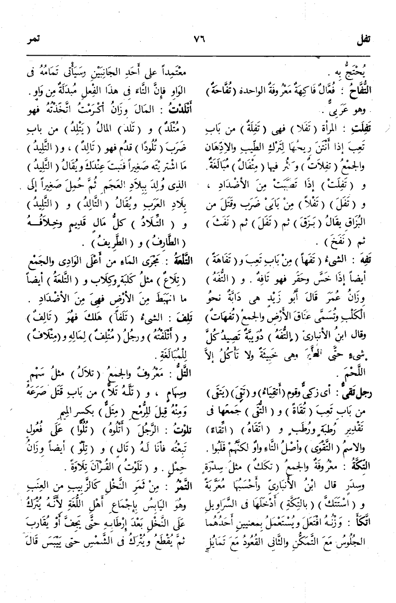 (ت ل ف) : تَلِفَ الشَّيْءُ تَلَفًا هَلَكَ فَهُوَ تَالِفٌ وَأَتْلَفْتُهُ وَرَجُلٌ مُتْلِفٌ لِمَالِهِ وَمِتْلَافٌ لِلْمُبَالَغَةِ.