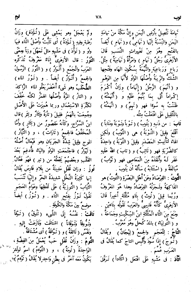 (ت وز) : تُوزُ وِزَانُ قُفْلٍ مَدِينَةٌ مِنْ بِلَادِ فَارِسَ يُقَالُ إنَّهَا كَثِيرَةُ النَّخْلِ شَدِيدَةُ الْحَرِّ وَإِلَيْهَا تُنْسَبُ الثِّيَابُ التُّوزِيَّةُ عَلَى لَفْظِهَا وَعَوَامُّ الْعَجَمِ تَقُولُ تَوْزُ بِفَتْحِ التَّاءِ وَتُوزُ أَيْضًا مَوْضِعٌ بَيْنَ مَكَّةَ وَالْكُوفَةِ.