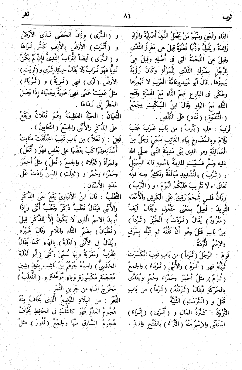(ث ر ب) : ثَرَبَ عَلَيْهِ يَثْرِبُ مِنْ بَابِ ضَرَبَ عَتَبَ وَلَامَ وَبِالْمُضَارِعِ بِيَاءِ الْغَائِبِ سُمِّيَ رَجُلٌ مِنْ الْعَمَالِقَةِ وَهُوَ الَّذِي بَنَى مَدِينَةَ النَّبِيِّ - صَلَّى اللهُ عَلَيْهِ وَسَلَّمَ - فَسُمِّيَتْ الْمَدِينَةُ بِاسْمِهِ قَالَهُ السُّهَيْلِيُّ وَثَرَّبَ بِالتَّشْدِيدِ مُبَالَغَةٌ وَتَكْثِيرٌ وَمِنْهُ قَوْله تَعَالَى {لا تَثْرِيبَ عَلَيْكُمُ الْيَوْمَ} [يوسف: 92] وَالثَّرْبُ وِزَانُ فَلْسٍ شَحْمٌ رَقِيقٌ عَلَى الْكَرِشِ وَالْأَمْعَاءِ.
