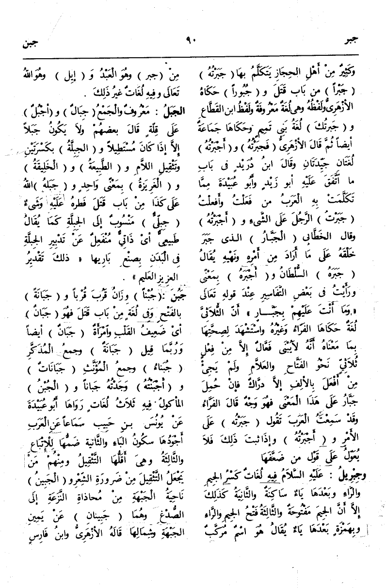 (ج ب ل) : الْجَبَلُ مَعْرُوفٌ وَالْجَمْعُ جِبَالٌ وَأَجْبُلٌ عَلَى قِلَّةٍ قَالَ بَعْضُهُمْ وَلَا يَكُونُ جَبَلًا إلَّا إذَا كَانَ مُسْتَطِيلًا.