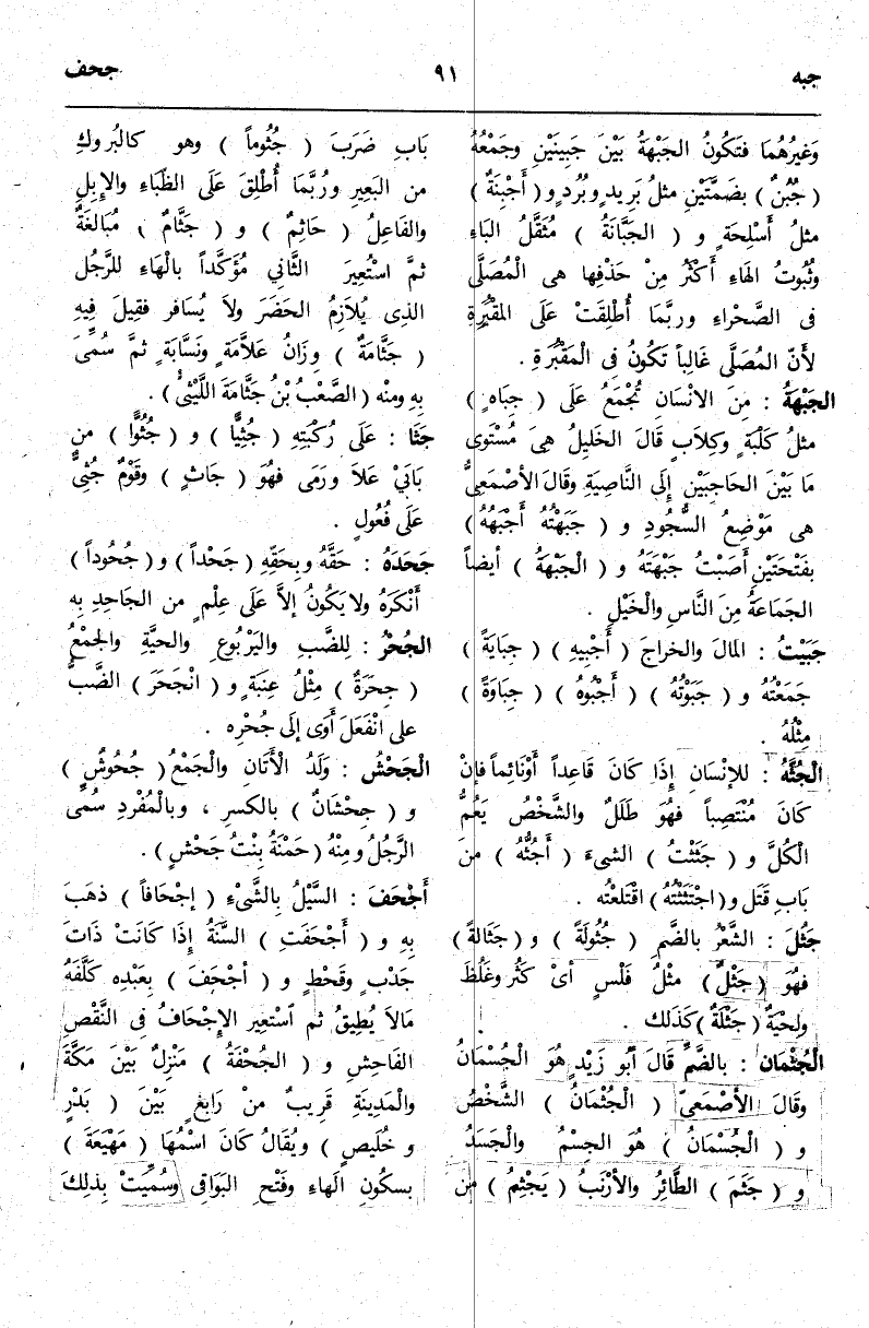 (ج ب هـ) : الْجَبْهَةُ مِنْ الْإِنْسَانِ تُجْمَعُ عَلَى جِبَاهٍ مِثْلُ: كَلْبَةٍ وَكِلَابٍ قَالَ الْخَلِيلُ هِيَ مُسْتَوَى مَا بَيْنَ الْحَاجِبَيْنِ إلَى النَّاصِيَةِ وَقَالَ الْأَصْمَعِيُّ هِيَ مَوْضِعُ السُّجُودِ وَجَبَهْتُهُ أَجْبَهُهُ بِفَتْحَتَيْنِ أَصَبْتُ جَبْهَتَهُ وَالْجَبْهَةُ أَيْضًا الْجَمَاعَةُ مِنْ النَّاسِ وَالْخَيْلِ.