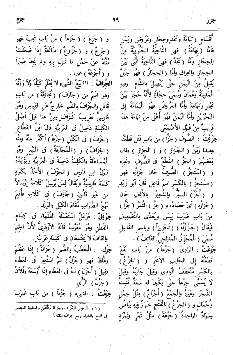 (ج ز ف) : الْجُزَافُ (¬1) بَيْعُ الشَّيْءِ لَا يُعْلَمُ كَيْلُهُ وَلَا وَزْنُهُ وَهُوَ اسْمٌ مِنْ جَازَفَ مُجَازَفَةً مِنْ بَابِ قَاتَلَ وَالْجُزَافُ بِالضَّمِّ خَارِجٌ عَنْ الْقِيَاسِ وَهُوَ فَارِسِيٌّ تَعْرِيبُ كُزَافٍ وَمِنْ هُنَا قِيلَ أَصْلُ الْكَلِمَةِ دَخِيلٌ فِي الْعَرَبِيَّةِ قَالَ ابْنُ الْقَطَّاعِ جَزَفَ فِي الْكَيْلِ جَزْفًا أَكْثَرَ مِنْهُ وَمِنْهُ الْجِزَافُ وَالْمُجَازَفَةُ فِي الْبَيْعِ وَهُوَ الْمُسَاهَلَةُ وَالْكَلِمَةُ دَخِيلَةٌ فِي الْعَرَبِيَّةِ وَيُؤَيِّدهُ قَوْلُ ابْنِ فَارِسٍ الْجَزْفُ الْأَخْذُ بِكَثْرَةٍ كَلِمَةٌ فَارِسِيَّةٌ وَيُقَالُ لِمَنْ يُرْسِلُ كَلَامَهُ إرْسَالًا مِنْ غَيْرِ قَانُونٍ جَازَفَ فِي كَلَامِهِ فَأُقِيمَ نَهْجُ الصَّوَابِ مُقَامَ الْكَيْلِ وَالْوَزْنِ.