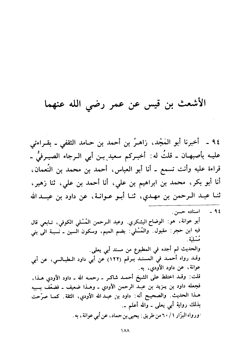 94 - أَخْبَرَنَا أَبُو الْمَجْدِ زَاهِرُ بْنُ أَحْمَدَ بْنِ حَامِدٍ الثَّقَفِيُّ بِقِرَاءَتِي عَلَيْهِ بِأَصْبَهَانَ قُلْتُ لَهُ أَخْبَرَكُمْ سَعِيدُ بْنُ أَبِي الرَّجَاءِ الصَّيْرَفِيُّ قِرَاءَةً عَلَيْهِ وَأَنْتَ تَسْمَعُ أَنا أَبُو الْعَبَّاسِ أَحْمَدُ بْنُ مُحَمَّدِ بْنِ النُّعْمَانِ أَنا أَبُو بَكْرٍ مُحَمَّدُ بْنُ إِبْرَاهِيمَ بْنِ عَلِيٍّ أَنا احْمَد بن عَليّ ثَنَا زُهَيْر ثَنَا عبد الرَّحْمَن بْنُ مَهْدِيٍّ ثَنَا أَبُو عَوَانَةَ عَنْ دَاوُدَ بن عبد الله الأودي عَن عبد الرَّحْمَن الْمُسْلِيِّ عَنِ الأَشْعَثِ بْنِ قَيْسٍ عَنْ عُمَرَ ابْنُ الْخَطَّابِ عَنِ النَّبِيِّ صَلَّى اللَّهُ عَلَيْهِ وَسَلَّمَ قَالَ لَا يُسْأَلُ الرَّجُلُ فِيمَا ضَرَبَ امْرَأَتَهُ