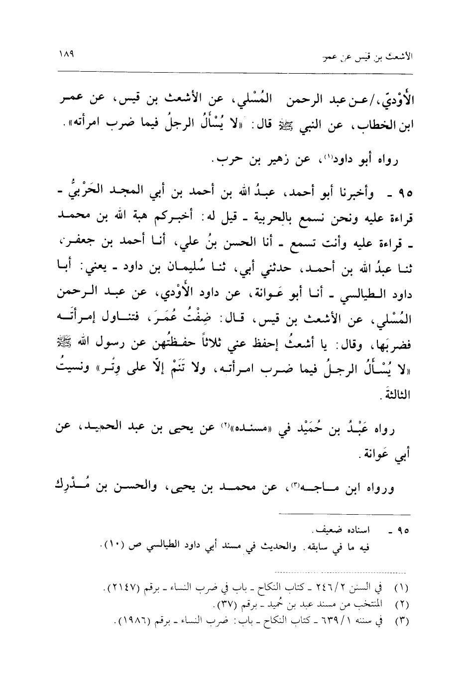 95 - وَأخْبرنَا أَبُو أَحْمد عبد الله بْنُ أَحْمَدَ بْنِ أَبِي الْمَجْدِ الْحَرْبِيُّ قِرَاءَةً عَلَيْهِ وَنَحْنُ نَسْمَعُ بِالْحَرْبِيَّةِ قِيلَ لَهُ أَخْبَرَكُمْ هِبَةُ اللَّهِ بْنُ مُحَمَّدٍ قِرَاءَةً عَلَيْهِ وَأَنْتَ تَسْمَعُ أَنا الْحَسَنُ بْنُ عَلِيٍّ أَنا أَحْمَدُ بن جَعْفَر ثَنَا عبد الله بْنُ أَحْمَدَ حَدَّثَنِي أَبِي ثَنَا سُلَيْمَانُ بْنُ دَاوُدَ يَعْنِي أَبَا دَاوُدَ الطَّيَالِسِيَّ أَنا أَبُو عوَانَة عَن دَاوُد الأودي عَن عبد الرَّحْمَن الْمُسْلِيِّ عَنِ الأَشْعَثِ بْنِ قَيْسٍ قَالَ ضِفْتُ عُمَرَ فَتَنَاوَلَ امْرَأَتَهُ فَضَرَبَهَا وَقَالَ يَا أَشْعَثُ احْفَظْ عَنِّي ثَلاثًا حَفِظْتُهُنَّ عَنْ رَسُولِ اللَّهِ صَلَّى اللَّهُ عَلَيْهِ وَسَلَّمَ لَا يُسْأَلُ الرَّجُلُ فِيمَا ضَرَبَ امْرَأَتَهُ وَلا تَنَمْ إِلا عَلَى وِتْرٍ وَنَسِيتُ الثَّالِثَةَ