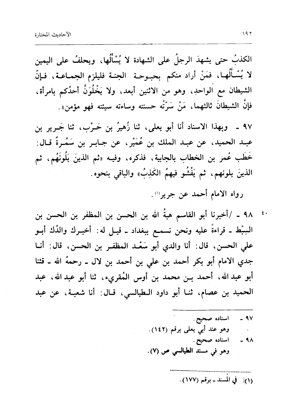 98 - أَخْبَرَنَا أَبُو الْقَاسِمِ هِبَةُ اللَّهِ بْنُ الْحَسَنِ بْنِ الْمُظَفَّرِ بْنِ الْحَسَنِ بْنِ السِّبْطِ قِرَاءَةً عَلَيْهِ وَنَحْنُ نَسْمَعُ بِبَغْدَادَ قِيلَ لَهُ أَخْبَرَكَ وَالِدُكَ أَبُو عَلِيٍّ الْحَسَنُ قَالَ أَنا وَالِدِي أَبُو سَعْدٍ الْمُظَفَّرُ بْنُ الْحَسَنِ قَالَ أَنا جَدِّي الإِمَامُ أَبُو بَكْرٍ أَحْمَدُ بْنُ عَلِيِّ بْنِ أَحْمَدَ بْنِ لالٍ رَحِمَهُ اللَّهُ قثنا أَبُو عبد الله أَحْمَدُ بْنُ مُحَمَّدِ بْنِ أَوْسٍ الْمُقْرِئُ ثَنا أَبُو عبد الله عبد الحميد بْنُ عِصَامٍ ثَنَا أَبُو دَاوُدَ الطَّيَالِسِيُّ قَالَ أَنا شُعْبَةُ عَنْ عَبْدِ
