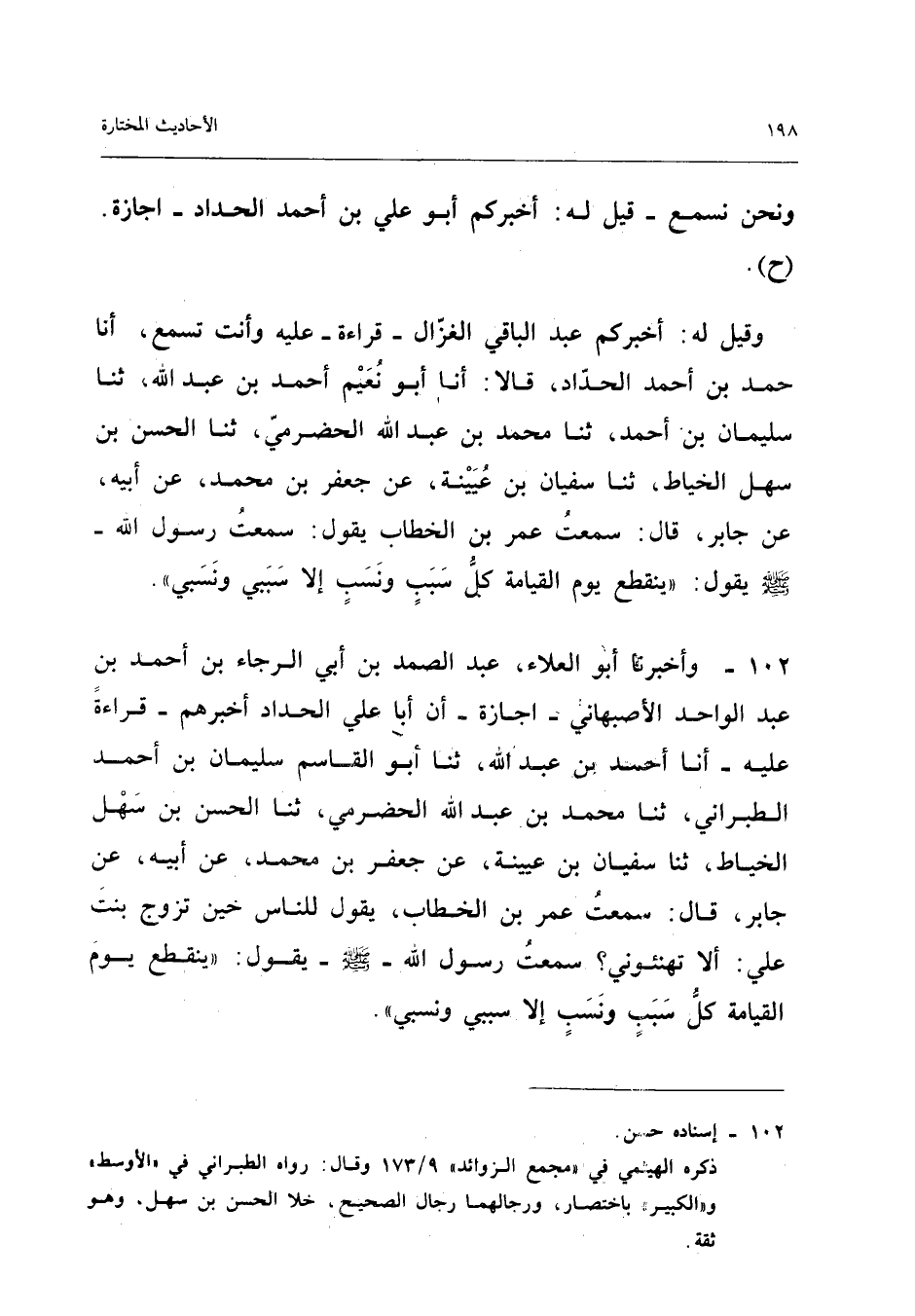 102 - وَأخْبرنَا أَبُو الْعَلَاء عبد الصَّمد بن أبي الرَّجَاء بن أَحْمد بن عبد الْوَاحِد الأَصْبَهَانِيُّ إِجَازَةً أَنَّ أَبَا عَلِيٍّ الْحَدَّادَ أَخْبَرَهُمْ قِرَاءَة عَلَيْهِ أَنا أَحْمد بن عبد الله ثَنَا أَبُو الْقَاسِمِ سُلَيْمَانُ بْنُ أَحْمَدَ الطَّبَرَانِيُّ ثَنَا مُحَمَّد بن عبد الله الْحَضْرَمِيُّ ثَنَا الْحَسَنُ بْنُ سَهْلٍ الْخَيَّاطُ ثَنَا سُفْيَانُ بْنُ عُيَيْنَةَ عَنْ جَعْفَرِ بْنِ مُحَمَّدٍ عَنْ أَبِيهِ عَنْ جَابِرٍ قَالَ سَمِعْتُ عُمَرَ بْنَ الْخَطَّابِ يَقُولُ لِلنَّاسِ حِينَ تَزَوَّجَ بِنْتَ عَلِيٍّ أَلا تُهَنِّئُونِي سَمِعْتُ رَسُولَ اللَّهِ صَلَّى اللَّهُ عَلَيْهِ وَسَلَّمَ يَقُولُ يَنْقَطِعُ يَوْمَ الْقِيَامَةِ كُلُّ سَبَبٍ وَنَسَبٍ إِلا سَبَبِي وَنَسَبِي