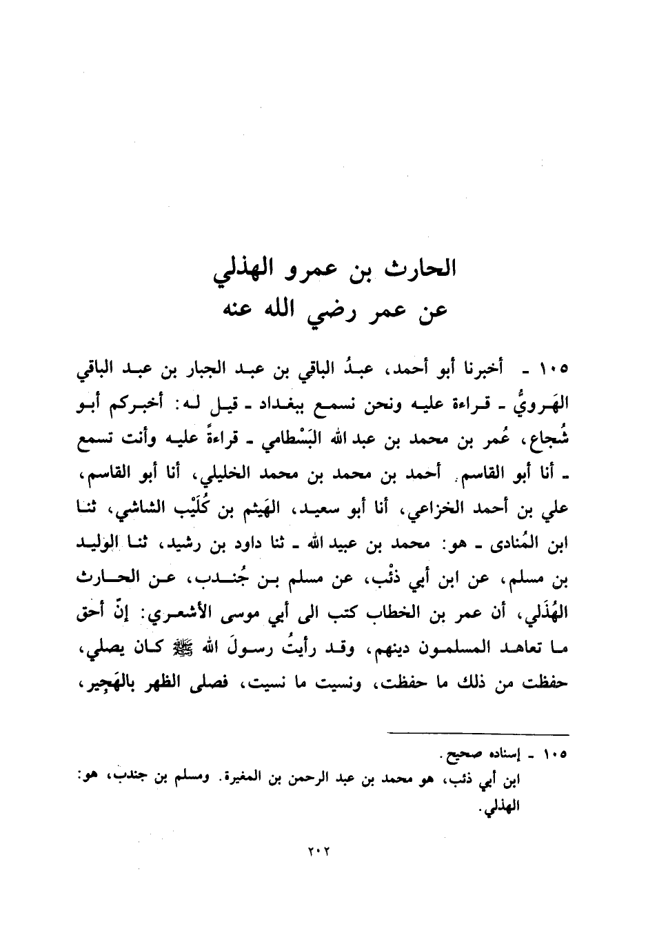 105 - أخبرنَا أَبُو أَحْمد عبد الْبَاقِي بن عبد الْجَبَّار بن عبد الْبَاقِي الْهَرَوِيُّ قِرَاءَةً عَلَيْهِ وَنَحْنُ نَسْمَعُ بِبَغْدَادَ قِيلَ لَهُ أَخْبَرَكُمْ أَبُو شُجَاعٍ عُمَرُ بْنُ مُحَمَّدِ بن عبد الله الْبَسْطَامِيُّ قِرَاءَةً عَلَيْهِ وَأَنْتَ تَسْمَعُ أَنا أَبُو الْقَاسِمِ أَحْمَدُ بْنُ مُحَمَّدِ بْنِ مُحَمَّدٍ الْخَلِيلِيُّ أَنا أَبُو الْقَاسِمِ عَلِيُّ بْنُ أَحْمَدَ الْخُزَاعِيُّ أَنا أَبُو سَعِيدٍ الْهَيْثَمُ بْن كُلَيْبٍ الشَّاشِيُّ ثَنَا ابْن المنادى هُوَ مُحَمَّد بن عبيد الله ثَنَا دَاوُدُ بْنُ رُشَيْدٍ ثَنَا الْوَلِيدُ بْنُ مُسْلِمٍ عَنِ ابْنِ أَبِي ذِئْبٍ عَنْ مُسْلِمِ بْنِ جُنْدُبٍ عَنِ الْحَارِثِ الْهُذَلِيِّ أَنَّ عُمَرَ بْنَ الْخَطَّابِ كَتَبَ إِلَى أَبِي مُوسَى الأَشْعَرِيِّ إِنَّ أَحَقَّ مَا تَعَاهَدَ الْمُسْلِمُونَ دِينُهُمْ وَقَدْ رَأَيْتُ رَسُولَ اللَّهِ صَلَّى اللَّهُ عَلَيْهِ وَسَلَّمَ كَانَ يُصَلِّي حَفِظْتُ مِنْ ذَلِكَ مَا حَفِظْتُ وَنَسِيتُ مَا نَسِيتُ فَصَلَّى الظُّهْرَ بِالْهَجِيرِ