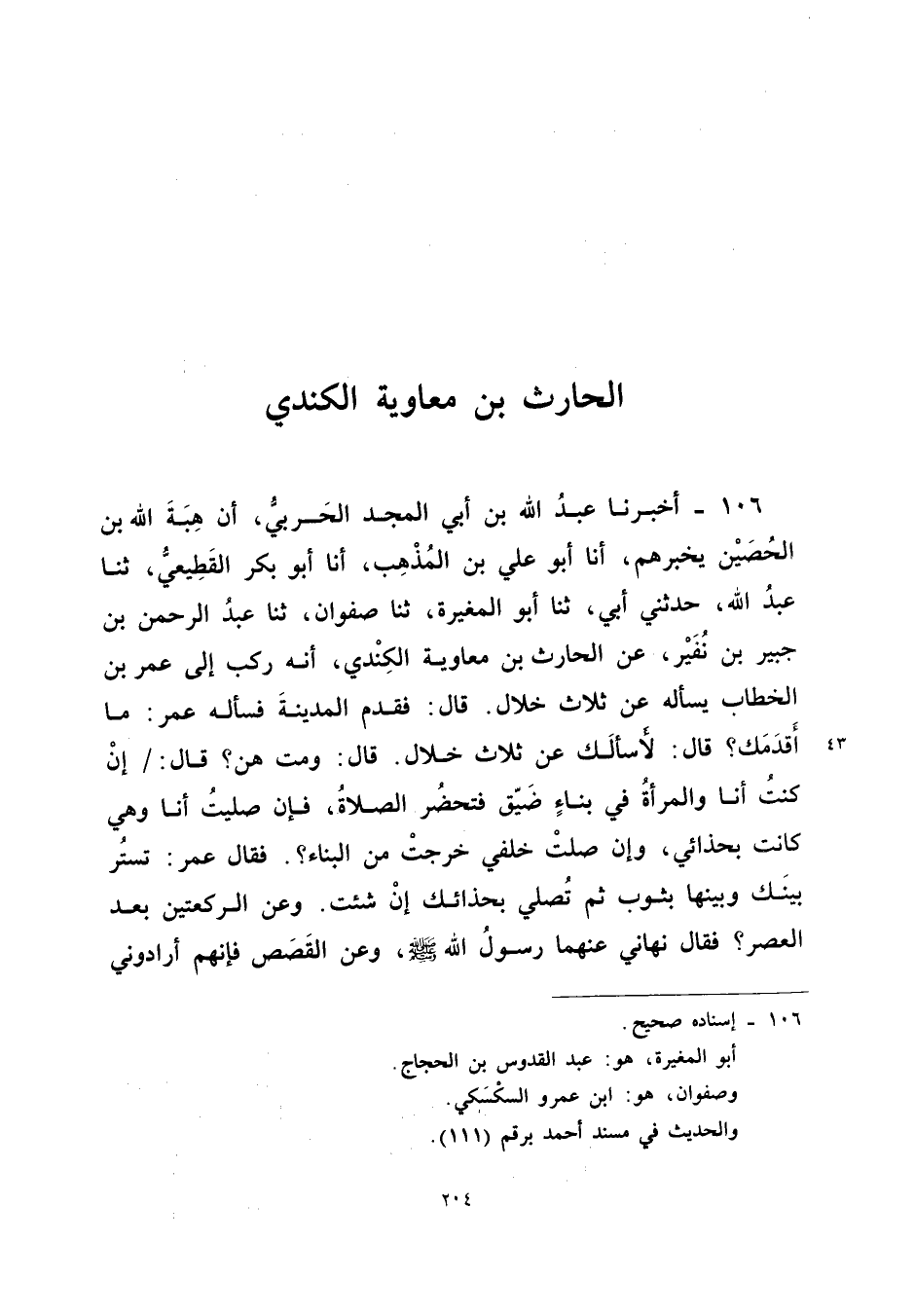 106 - أخبرنَا عبد الله بْنُ أَبِي الْمَجْدِ الْحَرْبِيُّ أَنَّ هِبَةَ اللَّهِ بن الْحصين يُخْبِرُهُمْ أَنا أَبُو عَلِيِّ بْنُ الْمُذْهِبِ أَنا أَبُو بكر الْقطيعِي ثَنَا عبد الله حَدَّثَنِي أَبِي ثَنَا أَبُو الْمُغِيرَةِ ثَنَا صَفْوَانُ ثَنَا عبد الرَّحْمَن بْنُ جُبَيْرِ بْنِ نُفَيْرٍ عَنِ الْحَارِثِ بْنِ مُعَاوِيَةَ الْكِنْدِيِّ أَنَّهُ رَكِبَ إِلَى عُمَرَ بْنِ الْخَطَّابِ يَسْأَلُهُ عَنْ ثَلاثِ خِلالٍ قَالَ فَقَدِمَ الْمَدِينَةَ فَسَأَلَهُ عُمَرُ مَا أَقْدَمَكَ قَالَ لأَسْأَلَكَ عَن ثَلَاث خلال قَالَ ومت هُنَّ قَالَ إِنْ كُنْتُ أَنَا وَالْمَرْأَةُ فِي بِنَاءٍ ضَيِّقٍ فَتَحْضُرُ الصَّلاةُ فَإِنْ صَلَّيْتُ أَنَا وَهِيَ كَانَتْ بِحِذَائِي وَإِنْ صَلَّتْ خَلْفِي خَرَجَتْ مِنَ الْبِنَاءِ فَقَالَ عُمَرُ تَسْتُرُ بَيْنَكَ وَبَيْنَهَا بِثَوْبٍ ثُمَّ تُصَلِّي بِحِذَائِكَ إِنْ شِئْتَ وَعَنِ الرَّكْعَتَيْنِ بَعْدَ الْعَصْرِ فَقَالَ نَهَانِي عَنْهُمَا رَسُولُ اللَّهِ صَلَّى اللَّهُ عَلَيْهِ وَسَلَّمَ وَعَنِ الْقَصَصِ فَإِنَّهُم أرادوني
