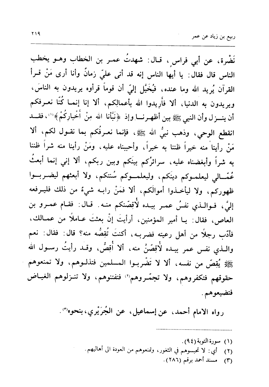 نَضْرَةَ عَنْ أَبِي فِرَاسٍ قَالَ شَهِدْتُ عُمَرَ بْنَ الْخَطَّابِ وَهُوَ يَخْطُبُ النَّاسَ قَالَ فَقَالَ يَا أَيهَا النَّاسُ إِنَّهُ قَدْ أَتَى عَلَيَّ زَمَانٌ وَأَنَا أَرَى مَنْ قَرَأَ الْقُرْآنَ يُرِيدُ اللَّهَ وَمَا عِنْده فيخيل إِلَيّ أَن قوما قرأوه يُرِيدُونَ بِهِ النَّاسَ وَيُرِيدُونَ بِهِ الدُّنْيَا أَلا فَأَرِيدُوا اللَّهَ بِأَعْمَالِكُمْ أَلا إِنَّا إِنَّمَا كُنَّا نُعَرِّفُكُمْ أَنْ يُنَزَّلَ وَأَنَّ النَّبِيَّ صَلَّى اللَّهُ عَلَيْهِ وَسَلَّمَ بَيْنَ أَظْهُرِنَا وَإِذْ {نَبَّأَنَا اللَّهُ من أخباركم} فَقَدِ انْقَطَعَ الْوَحْيُ وَذَهَبَ نَبِيُّ اللَّهِ صَلَّى اللَّهُ عَلَيْهِ وَسَلَّمَ فَإِنَّمَا نُعَرِّفُكُمْ بِمَا نَقُولُ لَكُمْ أَلا مَنْ رَأَيْنَا مِنْهُ خَيْرًا ظَنَنَّا بِهِ خَيْرًا وَأَحْبَبْنَاهُ عَلَيْهِ وَمَنْ رَأَيْنَا مِنْهُ شَرًّا ظَنَنَّا بِهِ شَرًّا وَأَبْغَضْنَاهُ عَلَيْهِ سَرَائِرُكُمْ بَيْنَكُمْ وَبَيْنَ رَبِّكُمْ أَلا إِنِّي إِنَّمَا أَبْعَثُ عُمَّالِي لِيُعَلِّمُوكُمْ دِينَكُمْ وَلِيُعَلِّمُوكُمْ سُنَّتَكُمْ وَلا أَبْعَثُهُمْ لِيَضْرِبُوا ظُهُورَكُمْ وَلا لِيَأْخُذُوا أَمْوَالَكُمْ أَلا فَمَنْ رَابَهُ شَيْءٌ مِنْ ذَلِكَ فَلْيَرْفَعْهُ إِلَيَّ فَوَالَّذِي نَفْسُ عُمَرَ بِيَدِهِ لأَقُصَّنَّكُمْ مِنْهُ قَالَ فَقَامَ عَمْرُو بْنُ الْعَاصِ فَقَالَ يَا أَمِيرَ الْمُؤْمِنِينَ أَرَأَيْتَ إِنْ بَعَثْتَ عَامِلا مِنْ عُمَّالِكَ فَأَدَّبَ رَجُلا مِنْ أَهْلِ رَعِيَّتِهِ فَضَرَبَهُ أَكُنْتَ تَقُصُّهُ مِنْهُ قَالَ فَقَالَ نَعَمْ وَالَّذِي نَفْسُ عُمَرَ بِيَدِهِ لأَقُصَّنَّ مِنْهُ أَلا أَقُصُّ وَقَدْ رَأَيْتُ رَسُولَ اللَّهِ صَلَّى اللَّهُ عَلَيْهِ وَسَلَّمَ يَقُصُّ مِنْ نَفْسِهِ أَلا لَا تَضْرِبُوا الْمُسْلِمِينَ فَتَذِلُّوهُمْ وَلا تَمْنَعُوهُمْ حُقُوقَهُمْ فَتَكْفُرُوهُمْ وَلا تُجَمِّرُوهُمْ فَتَفْتِنُوهُمْ وَلا تُنْزِلُوهُمُ الْغِيَاضَ فَتُضَيِّعُوهُمْ